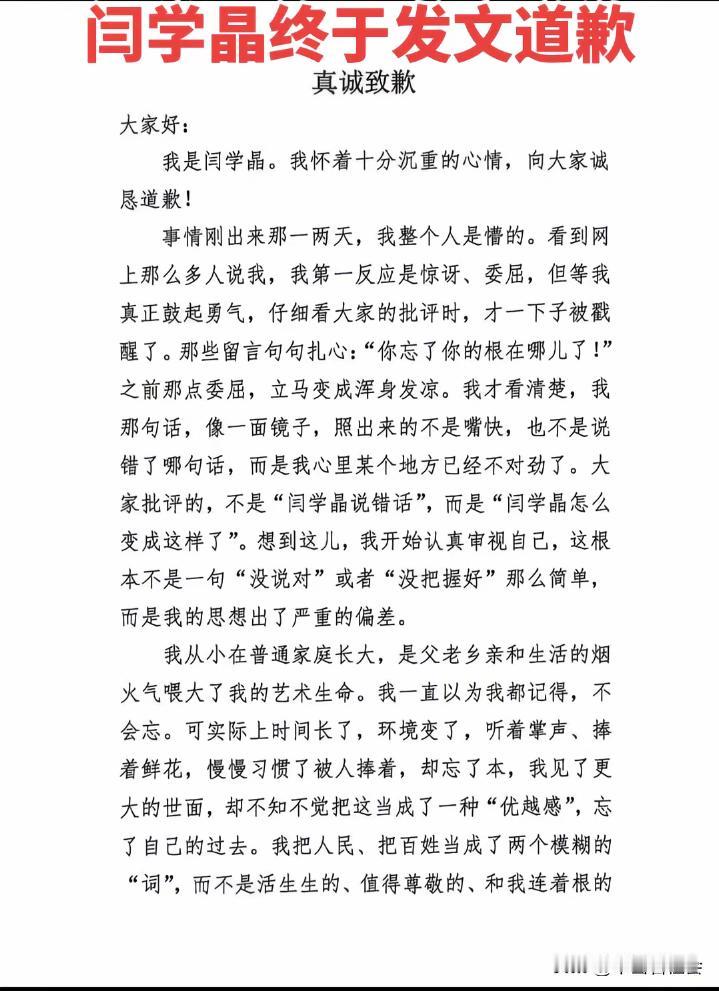 著名演员闫学晶发文道歉。 整个文章看起来特别的真诚,她最后诚恳的接受大家的监督和批评!