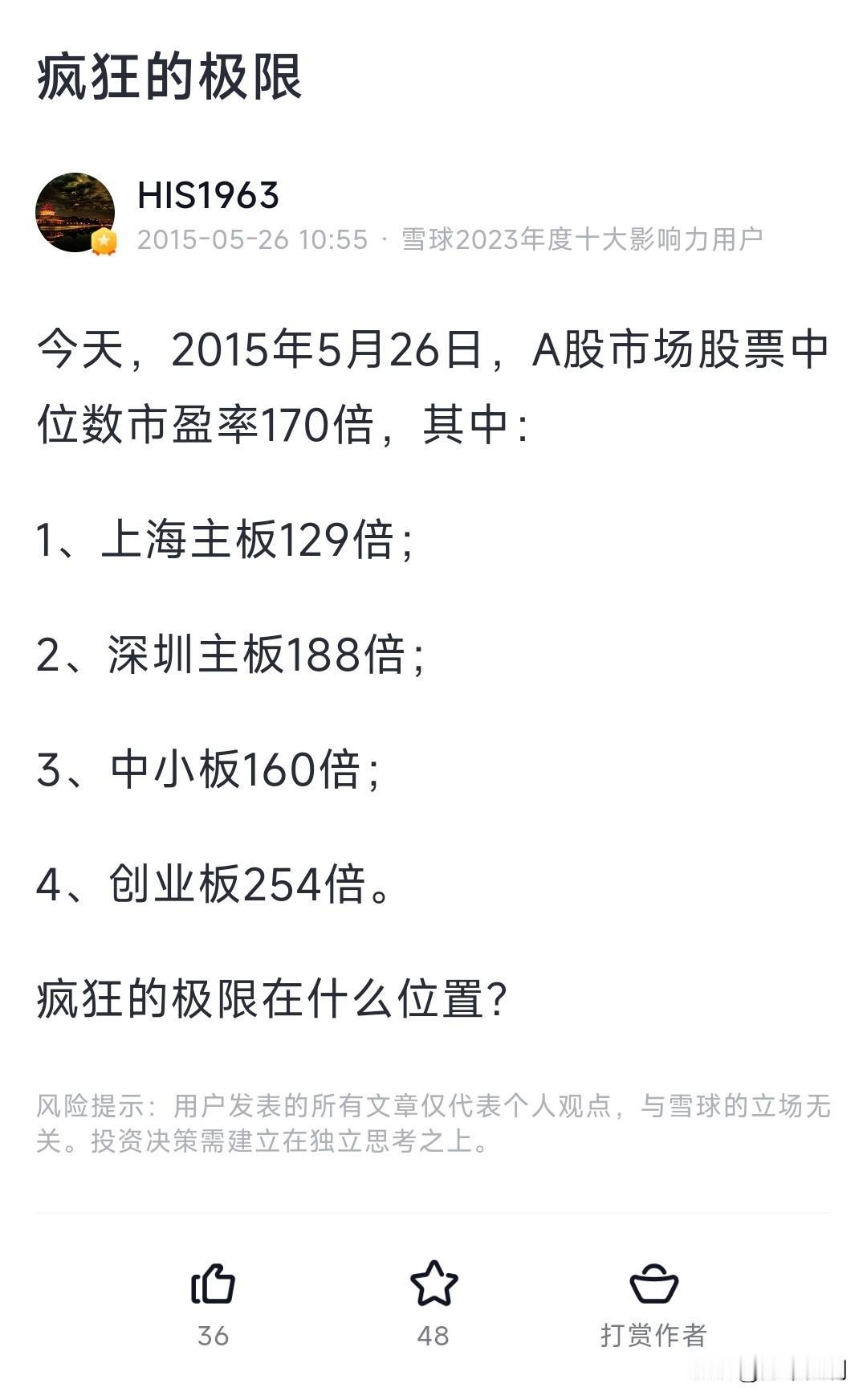 还是我孤陋寡闻了,本以为现在股市个股中位数市盈率80倍左右够高了,没想到2015年顶峰时把中位数市盈率干到了170倍,如果牛市顶峰照这种估值,指数还得翻倍?那不是要把大盘指数干到8000点?