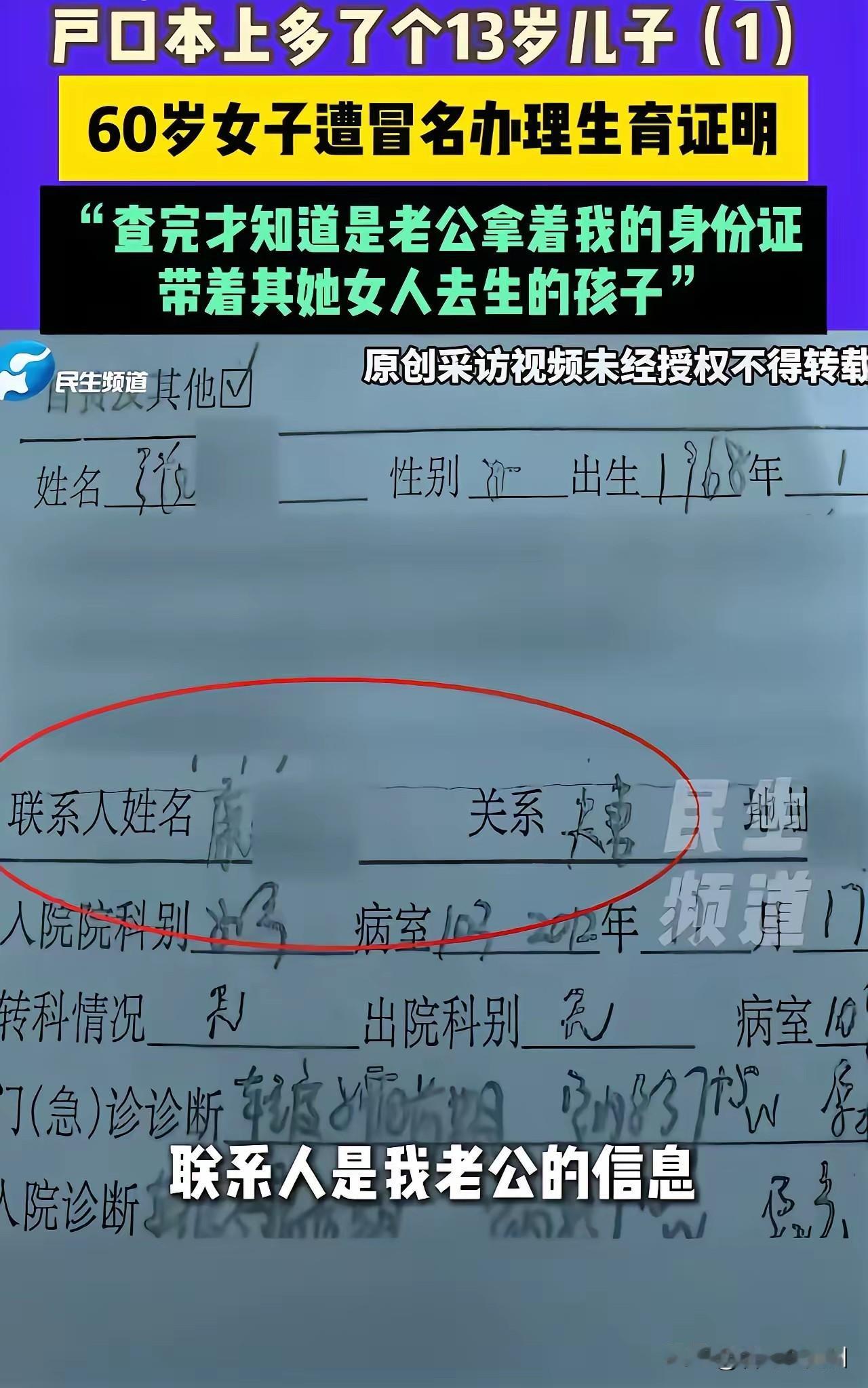 结扎29年!60岁老太户口本惊现13岁儿子,丈夫一句话气炸全网! 老天爷,电视剧都不敢这么编!河南一位60岁的张女士,只是去补办个户口本,竟发现自己名下凭空多出一个13岁的“儿子”!可她明明已经结扎了29年,最小的亲生孩子都31岁了。这“天上掉下来”的儿子,到底是从哪儿冒出来的? 张女士第一反应是派出所弄错了,可民警却冷冰冰甩话:“系统早就登记了,出生证明都有!”她懵了,谁会用她的身份生孩子?想来想去,脊背发凉——只能是一个人:她同床共枕几十年的丈夫! 一查医院记录,真相让人头皮发麻。果然,病历上是张女士的名字,签字却是丈夫的笔迹。原来,丈夫早在多年前就出轨,情人怀孕后,他竟偷拿妻子身份证,冒名顶替带情人产检、分娩,最后还顺利上了户口!更荒诞的是,面对质问,丈夫支支吾吾嘟囔:“我也不确定孩子是不是我亲生的……” 离了大谱!自己出轨,却让妻子“被当妈”;孩子是不是亲生的都没搞清,就敢塞进老婆户口本? 而整个过程,医院没核实产妇是否本人,派出所没比对身份信息,审核全像“空气”,一路绿灯!这已不是简单的家庭狗血剧,而是赤裸裸的身份盗窃! · “这男人是薅羊毛专薅自家老婆?‘借妻生子’这招真是绝!” · “医院和派出所是在闭眼盖章吗?哪天我们被结婚了可能都不知道!” · “看得心惊胆战!今天能被当妈,明天是不是就被负债、被法人了?” 这件事最可怕的,从来不是丈夫多荒唐,而是我们的身份信息竟像一张纸,轻易就能被冒用、被篡改。 如果系统漏洞不补,审核流程形同虚设,那么每个人都可能成为下一个“张女士”——你在家里坐着,社会上却多出一个你的“孩子”、你的“债务”、甚至你从未见过的“配偶”! 身份安全无小事,制度漏洞必须堵! 你觉得,这次事件中,是丈夫更可恶,还是审核的各个环节更失职?来评论区说说你的看法! 被当妈 身份盗用 审核漏洞 社会热点