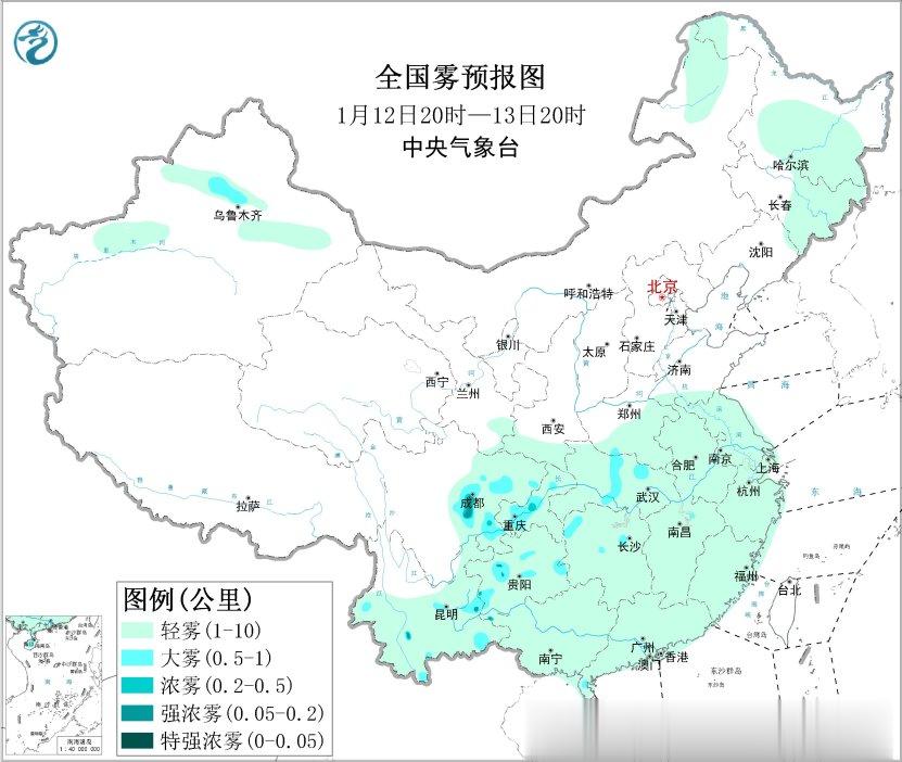 12日夜间至13日早晨,新疆天山北坡、四川盆地中南部、贵州西部、云南中南部有大雾天气,局地能见度不足200米。