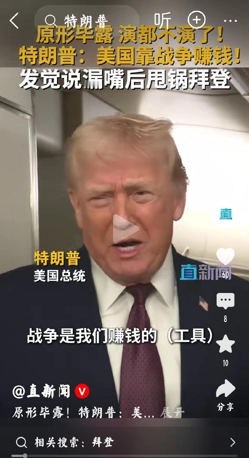 实话实说 请看今日的报道,特朗普公开演讲中实话实说,真情实意的表露:“美国是靠战争发财”。 个人认为:当然这种真情实意的实话实说,仅仅停留不到两秒钟,但也是真情实意的实话实说。 在发觉不对时,特朗普就展开了“特朗普特色的话术”毫不犹豫的甩给了千年背锅王-前任美国总统拜登。 可这实在是不像特朗普为人性格。最近,特朗普实在是太忙了。委内瑞拉还没完全搞定,美国石油公司不愿投资委内瑞拉。就又要打格陵兰岛的主意,同时还算计着中东伊朗,这还没结束,就又在制裁加勒比海国家-古巴。美国实在是属貔貅的。