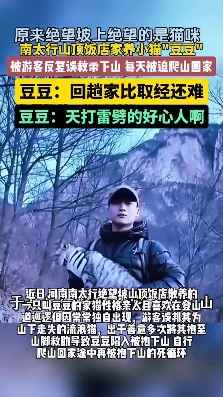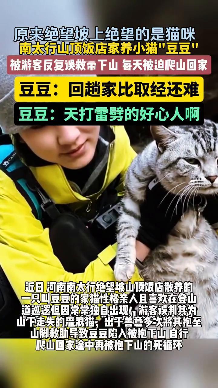 “笑不活了!”近日,河南,一男子到南太行爬山,到达绝望坡时发现了一只猫咪,以为小猫迷路了,便好心将猫送下山,后来才知道,小猫的家在山顶饭店,而小猫每次爬到半山腰,都被“好心人”送下了山。网友:原来“绝望坡”绝望的是猫咪呀。 这事儿真叫人哭笑不得,河南南太行的“绝望坡”最近火了一把,倒不是因为山势多么险峻,而是因为一只不得不面对“猫生艰难”的小家伙。本来是去山里放松心情的游客,硬生生把一只原本悠闲的“地头蛇”逼成了“特种兵”。 故事的主角是一只名叫豆豆的橘白花色猫咪,它可是这片山头的常驻居民。平日里,豆豆最喜欢在悬崖峭壁间的登山道上溜达,一方面是巡视领地,一方面也是为了消食。它长得膘肥体壮,性格又格外亲人,见到路人也不躲闪,这就给它招来了“大麻烦”。 很多气喘吁吁爬到半山腰的游客,乍一看到这么一只孤零零又粘人的小猫,第一反应往往是同情心泛滥。大家伙儿看着它那无辜的眼神,下意识就觉得这肯定是哪家贪玩走丢的宠物,或者是流浪到山上迷了路,怕它在荒郊野岭挨饿受冻。 于是,一幕幕让人啼笑皆非的“误救”大戏就开始了。好心人们也不管自己累不累,抱起沉甸甸的豆豆就往山下运,觉得自己做了一件大好事。可怜的豆豆,明明家就在山顶的饭店里,只因为下楼遛了个弯,就被热情的陌生人强行“绑架”到了山脚下。 这下可好,豆豆要想回家,就得靠自己的四条腿重新爬一遍著名的“绝望坡”。这坡度的名字真不是白叫的,对于人类来说都极具挑战,更别提被迫折返跑的猫了。最惨烈的一天,据说豆豆足足被三波不同的好心人接力抱下山,每一次它都得哼哧哼哧往回爬。 那天直到夜幕降临,山顶饭店的老板迟迟不见自家爱宠的身影,担心出了意外,打着手电一路寻到山下。结果半道上,正好撞见累得几乎瘫软、还在顽强往上爬的豆豆。那一刻,这只猫心里的阴影面积估计比太行山还大,简直就是现实版的“西天取经”。 为了终结这场充满善意的“折磨”,老板也是操碎了心,专门给豆豆脖子上挂了个显眼的小牌子。上面明明白白写着它的身世和住址,就差拿大喇叭喊“别救了,我家在上面”。这下大家才恍然大悟,原来这绝望坡上最绝望的不是爬山的游客,而是这只只想回家的猫。 网友们看完这段经历,一边心疼一边忍不住乐,调侃说豆豆这哪里是爬山,分明是在渡劫。原本以为是流浪猫遇险记,结果反转成了“过度关爱”受难记。现在再去南太行,恐怕大家再看到豆豆,都会默契地给它让条路,毕竟让人家回趟家,实在是太不容易了。