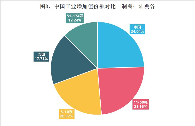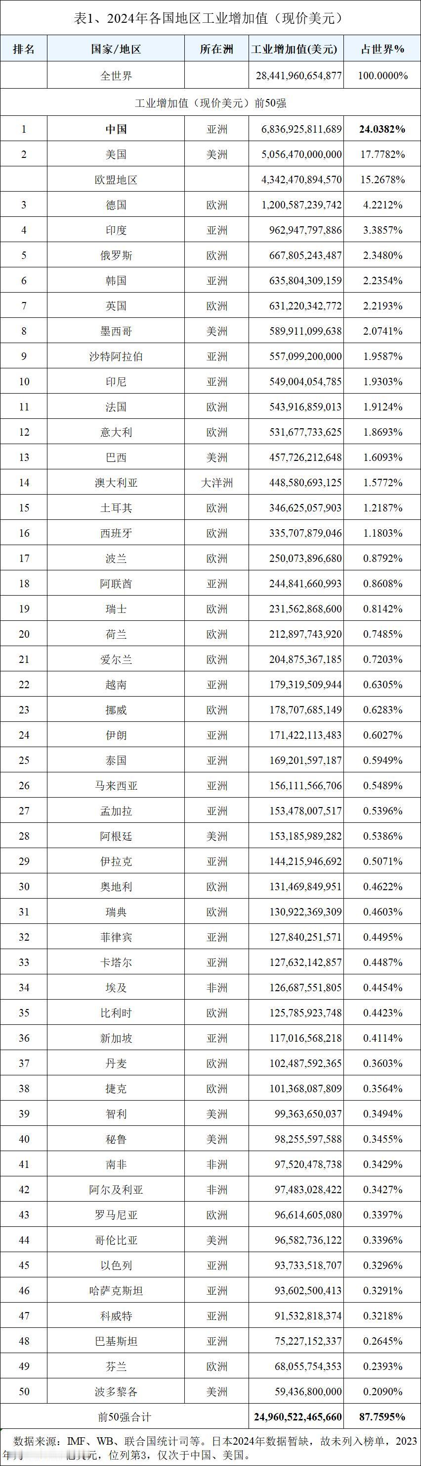 工业增加值前50强,谁是黑马? 工业增加值是指工业企业在报告期内(通常是年度)以货币形式表现的工业生产活动的最终成果;是工业企业全部生产活动的总成果扣除了在生产过程中消耗或转移的物质产品和劳务价值后的余额;是工业企业生产过程中新增加的价值。 按现价美元计算,2024年工业增加值前50强是中国、美国、德国、印度和俄罗斯等50个国家、地区,如下表: 前50强工业增加值(现价美元)合计达249605.22亿美元,相当于全球工业增加值的87.76%,其中中美两国合计达118933.96亿美元,占全球的41.82%——超过2/5。 其中,发达国家有19个,发展中国家有31个,一些老牌工业发达国家,如葡萄牙、匈牙利和希腊等国,居然挤不进去前50强。 前5强是: 1、中国68369.26亿美元,占世界工业增加值比重高达24.04%,近1/4,领先于美国,也高于欧盟27个成员国总和43424.71亿美元,高于第3至第10的8个前10强的总和57943.79亿美元,甚至高于第11至第50强40个国家、地区总和67288.36亿美元,甚至相当于剩下的124个国家地区(51-174)总和34814.82亿美元的1.96倍!如下图: 2、美国50564.7亿美元,约占比17.78%。美国曾长期是全球的工业霸主,自1890年工业产值超过大英帝国以来,曾连续120年霸占全球工业增加值榜首,直至2010年才被中国超越,目前仍是全球最先进的工业国。 3、德国12005.87亿美元,约占比4.22%。德国是老牌工业强国,曾是科技、工业综合实力最强、最先进的国家之一,最先发明了导弹。 4、印度9629.48亿美元,约占比3.39%。印度超越了众多老牌工业强国,晋身前4大工业国,确实令人瞩目,是世界上少数几个拥有核工业、核武、航天、造航母等高端设备的国家之一。 5、俄罗斯6678.05亿美元,约占比2.35%。俄罗斯继承了前苏联大部分资产,但工业整体衰退。 前50强中,比较惊喜的是越南,这个曾经落后的农业国,工业增加值居然挤进前50大国,排第22位,总值1793.20亿美元,约占世界工业增加值的0.63%,超越东南亚11国中的发达国家新加坡,也超越了亚洲四小虎中的泰国、马来西亚、菲律宾,仅次于印尼,位居东南亚第2位。2025年工业增加值增长了8.8%,总额攀升至约1951亿美元,逼近发达国家爱尔兰。 注:榜单中暂缺日本2024的数据,故未列入;2023年日本位列第4,仅次于德国。