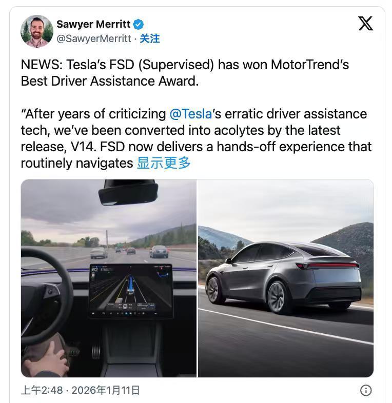 特斯拉FSD获最佳驾驶辅助奖 在对特斯拉最新的FSD v14进行测试后,《MotorTrend》授予它“2026年度最佳驾驶辅助技术奖”。这是个有意思的转变,因为《MotorTrend》此前曾批评FSD早期版本存在诸多不稳定,表现落后于通用汽车Super Cruise等竞争对手。 而他们认为最新一代的FSD系统解决了此前的不足,在复杂的城市路况下表现更加平顺,包括无保护左转、环岛、紧急车辆避让以及拥挤的城市街道通行。虽然仍需驾驶员持续监控,但评委们一致认为,目前没有任何其他高级驾驶辅助系统能够匹敌其功能之全面。 再加上完全不依赖激光雷达,《MotorTrend》指出FSD的实用性更强,能够应对几乎所有路况,比福特BlueCruise、通用Super Cruise等竞品更优秀。【来自懂车帝车友圈】