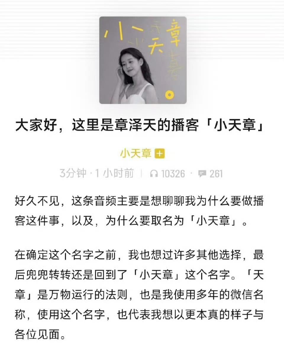 章泽天播客爆了,在刘嘉玲家里聊梁朝伟! 今天,章泽天的个人播客《小天章》上线了。名字是她用了好多年的微信昵称,她说想用最本真的状态跟大伙儿聊聊天。 第一期节目,就整了个大的,直接跑到刘嘉玲香港的家里录去了。 那地方可不一般,刘嘉玲管它叫“记忆之屋”,满是和张国荣那些老朋友的回忆。俩人就坐在那儿,从苏州童年聊到香港往事。 最逗的是,刘嘉玲爆了个梁朝伟的料,说这位出了名的“社恐”影帝,在家可爱写道歉卡片了。这反差,听着就挺有意思。 节目还没全放出来,就一个3分钟的自我介绍,一小时收听就破了万,两小时订阅快九千,数据是实打实的火。 可网友吵得也挺热闹。有人喊话,下期能不能请刘强东,聊聊京东那些事;也有人觉得,首期热度全靠刘嘉玲撑着,章泽天自个儿行不行? 要我说,这事得这么看。章泽天早不是当年那个“奶茶妹妹”了,投资人、公益、去剑桥读书,标签换了好几个。 现在做播客,聊商业、聊技术、聊女性成长,明显是想更主动地发出自己的声音。 她手上那些顶级的商业和名人资源,本身就是硬实力,能请动刘嘉玲在家对谈,已经说明了很多问题。 名人扎堆做播客不新鲜,但像她这样,带着明确的话题和资源进场,可能真能给这行业带来点新东西。至少,让播客从小圈子的自嗨,更快地走到大众眼前。 这节目到底成色如何,明天全长版上线,听完再说。但一个女人,不断撕掉旧标签,努力拓展新舞台,这份劲头,本身就值得听听看。