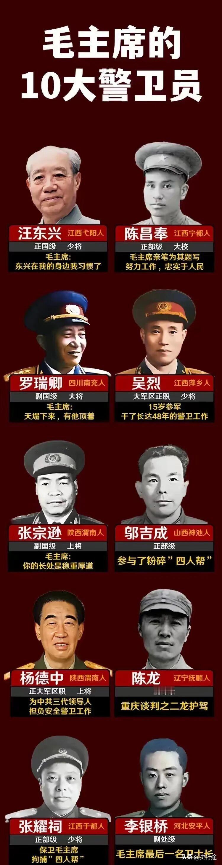 毛主席的历任警卫员 汪东兴:正国级,少将; 罗瑞卿:副国级,大将; 张宗逊:副国级,大将; 杨德中:正大军区,上将; 张耀词:正部级,少将; 陈昌奉:正部级,大校; 吴 烈:大军区正职,少将; 邬吉成:正部级; 陈 龙:副部级; 李银桥:副处级。 今天我们要聊的是张耀祠 张耀祠这一生,离毛主席几步路远。参加红军后站的第一班岗,就守在毛主席办公室门口,新中国成立后又做到“8341”中央警卫团团长,从陕北一路跟到中南海,看住几扇最要紧的门。 1937年1月13日,中共中央和军委机关从保安迁往延安,他跟着机关进了陕北,在窑洞里干了十多年,在几个机关做过副官和警卫。 那时候风一刮,土顺着台阶往屋里灌,人抖抖身上的尘土,转身还得去盯门、跑腿、传话。 1947年初,蒋介石调集约25万兵力,分三路进攻陕甘宁边区,命胡宗南率14万直扑延安,想一口气端掉中共中央。3月18日18时,中央警备团的刘辉山、张廷桢、古远新等人和张耀祠,带两个连和一个骑兵中队,在连天炮火里护送党中央和毛主席撤出延安,几百人对着十倍敌军,摸黑把车队拖出山路,车灯都不敢开太亮,只能听着马蹄声和炮声往前挪。 1948年4月,毛主席率中央机关东渡黄河,到太行山一带部署全局。 5月27日,到平山县西柏坡,当晚就主持中央书记处会议;9月8日至13日,又在西柏坡开“九月会议”,把一句话说死——一切可能和必须集中的权力,往中央代表机关手里集中,指挥链拉直了,仗也就好打些。 1953年5月的一天,公安部九局局长汪东兴在中南海叫来张耀祠,说中央决定成立中央警卫团,专门保卫党中央领导核心和几位中央书记,并负责中南海内重要党政军机关的安全,决定调他任九局副局长兼中央警卫团团长。 张耀祠连声说怕完不成任务,脸都绷紧了,听到“上级已经决定,不能变了”,只好硬着头皮接下,不接也得接。 后来中央警卫团以中央警卫师一团为基础组建,代号“8341”,建制归中央军委总参谋部,警卫任务归公安部九局。 6月9日,中南海团部会议室开排以上干部会,正式宣布成立,由张耀祠负责带队。 刚组建时编制近千人,之后越扩越大,成了几千人的队伍。 人民大会堂、天安门、钓鱼台、北戴河和重要车队路线,都在他们的警戒范围,内卫落在“8341”一中队身上,毛主席在中南海办公,或外出巡视,这一中队总是离他不远不近,几步之内。 新中国成立后,他先后任公安部九局副局长、中央警卫团团长、中央办公厅副主任,就住在毛主席卧室旁边的更衣室,门一推开就是一条不宽的走廊。 夜里听着屋里翻书、咳嗽、批稿的动静,灯光从门缝底下漏一道线出来,一直拖到后半夜。 毛主席平日吃得不算讲究,多数时候一天两餐,以大米糙米配青菜辣椒为主,有条件时加一盘红烧肉或一条武昌鱼,不喝牛奶,不爱酒,却离不开茶,对杭州龙井格外上心,每年都要警卫托人定购新茶。 茶壶就放在手边,水凉了续,续到茶叶发白再换。 书倒是看得很讲究。他说过,饭可以一天不吃,觉可以一天不睡,书一天不能不读。 卧室床上有三分之一被书占着,会客室和厕所里也摆着书和铅笔,出门视察要带两三箱书,车上摇摇晃晃,他照样摊开来看。 常翻《共产党宣言》,《资治通鉴》据说读了二十多遍。 古典小说里,他格外看重《红楼梦》,从青年时代就开始读,先当故事看,后来当历史看,说不读几遍《红楼梦》,连封建社会都摸不准,经常让工作人员去看《红楼梦》和《三国演义》,像嘱咐人吃药一样,一遍一遍地叮嘱。 礼物这件事,他盯得也严。 地方送来的礼品,都要先向他报告,他知道后,按物折价把钱寄回去,或者让有关部门写信说明心意已领;外宾送的贵重礼品一律上交,退不掉的地方特产,偶尔留下来的,也多分给大师傅和警卫、护士。 平时节约水电,火柴盒也要留下装散火柴;开国大典那套制服只穿了一天就送给身边工作人员,后来接见外宾、开大会才穿统一制服,其余时候多是便服或睡衣,衬衣、睡衣、毛巾被上补丁七拼八凑,他只认一个标准,不露肉、不透风。 1974年9月,菲律宾前总统马科斯的夫人伊梅尔达来华访问。 那时毛主席眼疾很重,人不在北京,她在会见周恩来、李先念后多次表示希望当面沟通,中央权衡后,毛主席同意在长沙会见。 会面时,他聊了近年的情况,她谈菲律宾的打算,知道她爱唱,就随口请她唱一曲,她用中文唱起《我爱北京天安门》,那句“我爱北京天安门,天安门上太阳升”,唱得字还不太准,人却唱得很认真。 后来,她通过菲律宾驻华使馆送来几筐新鲜芒果,放久了容易坏,果香在屋里一阵阵地荡。 张耀祠让张玉凤请示,要不要给在北京的子女分一些,毛主席笑着说,你们照顾我比子女周到,这些芒果还是转给大师傅和警卫、护士吧。 守在门口的人,看得见战火中的车灯,也看得见这种日常里的举动,就这样把一个领袖看成了有脾气、有规矩的老人。