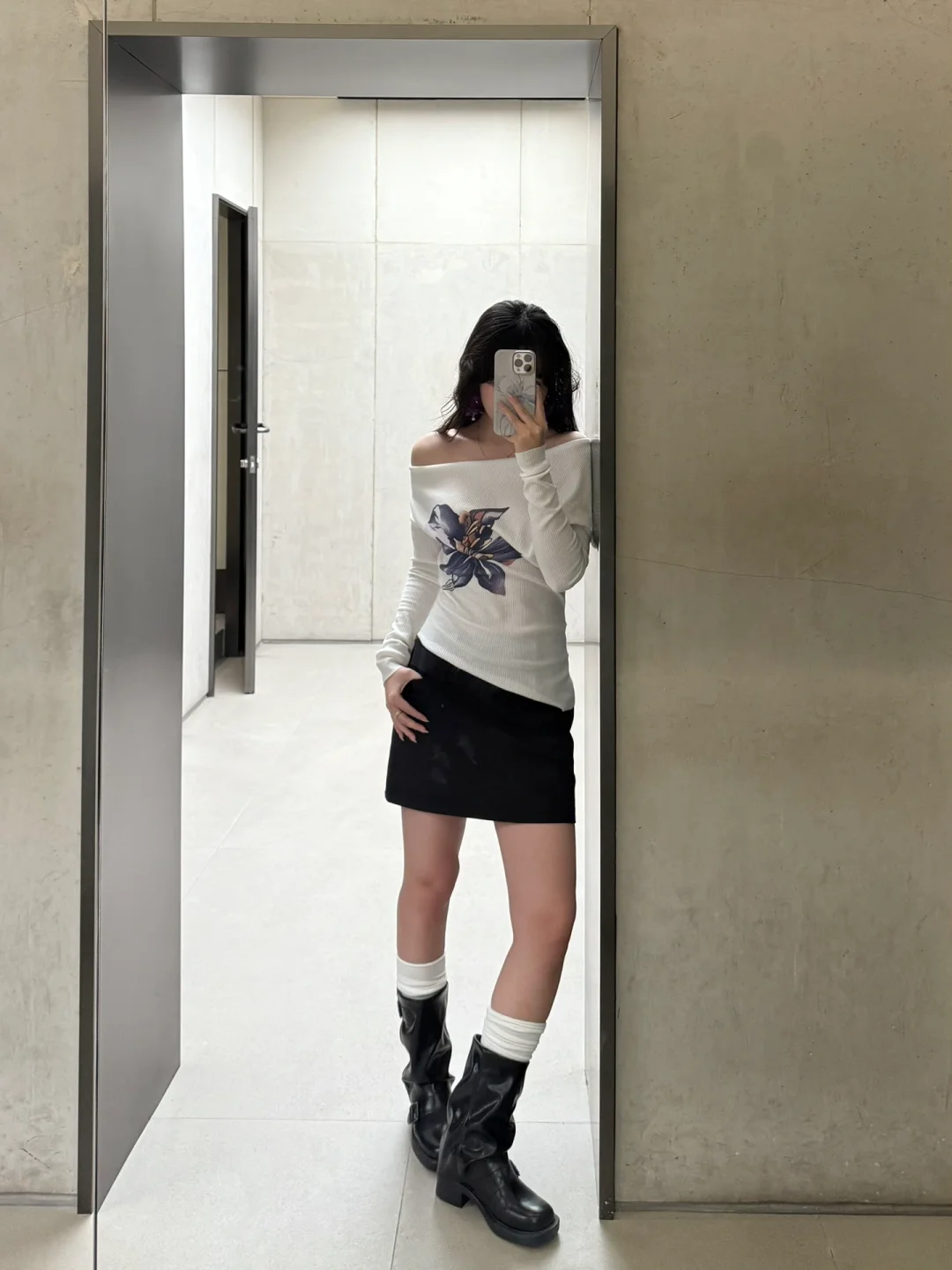 一位长相漂亮、身材出众的姑娘,穿上了一件对身材要求极高的紧身款一字肩粉色针织衫搭