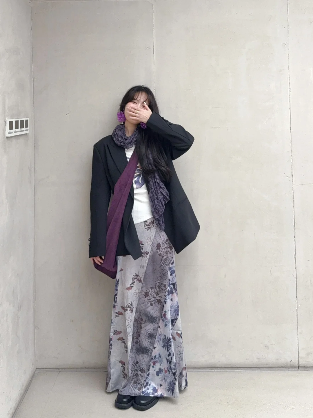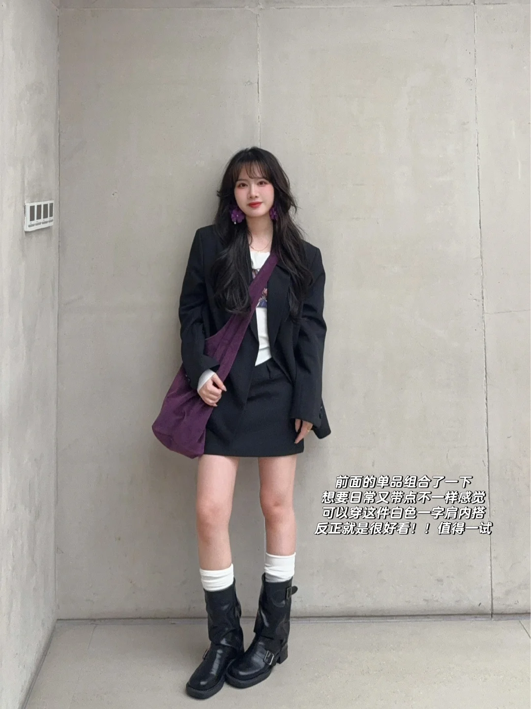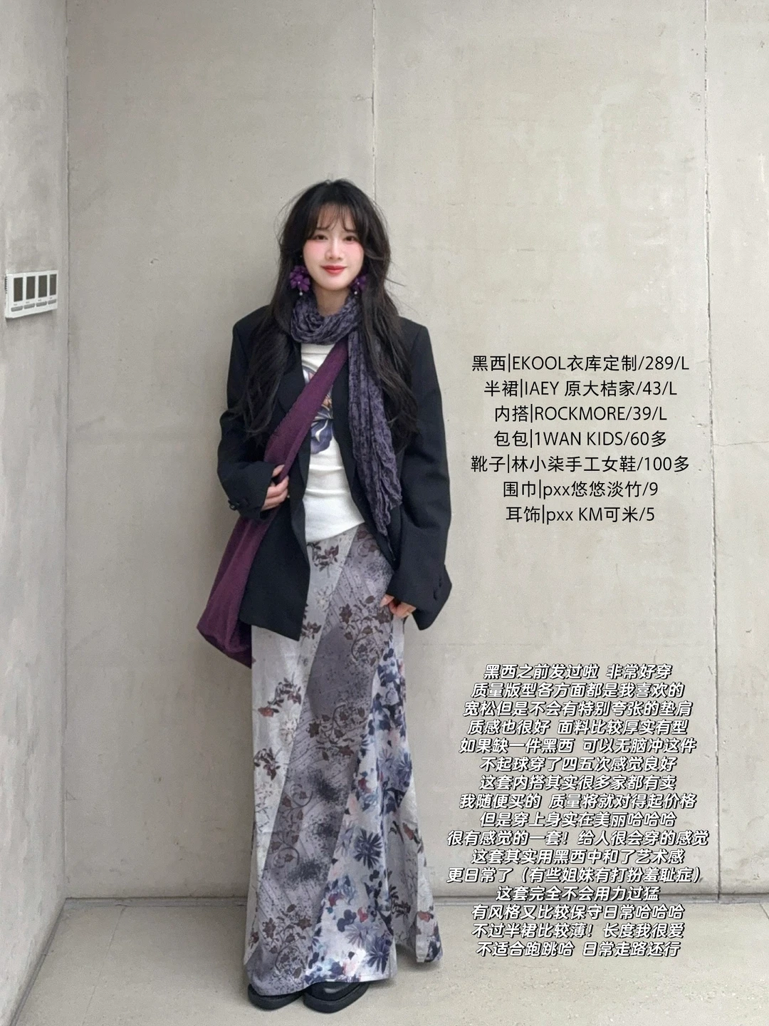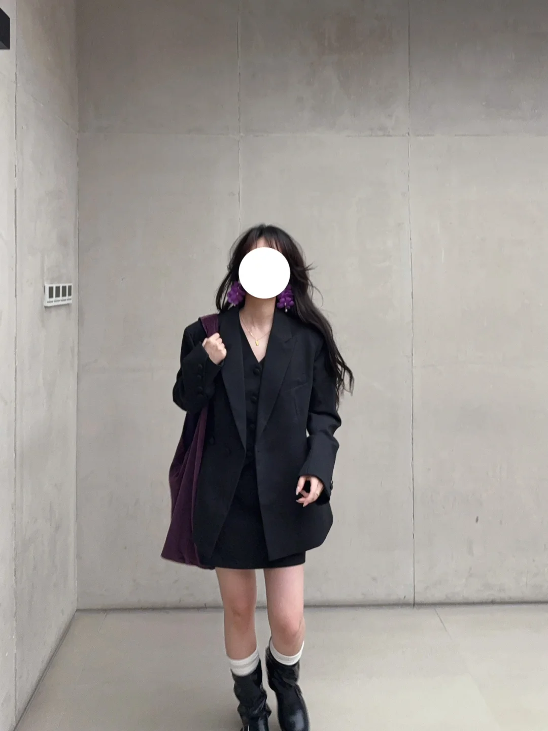 168/106左右 黑色西装的一期新的穿搭思路 紫色系➕艺术系➕风格化穿搭 属于有点调调但不会不日常那种 黑西有无限可能 真的 这件外套我上一期搭配裤子比较多 喜欢裤子的姐妹可以参考上一期~