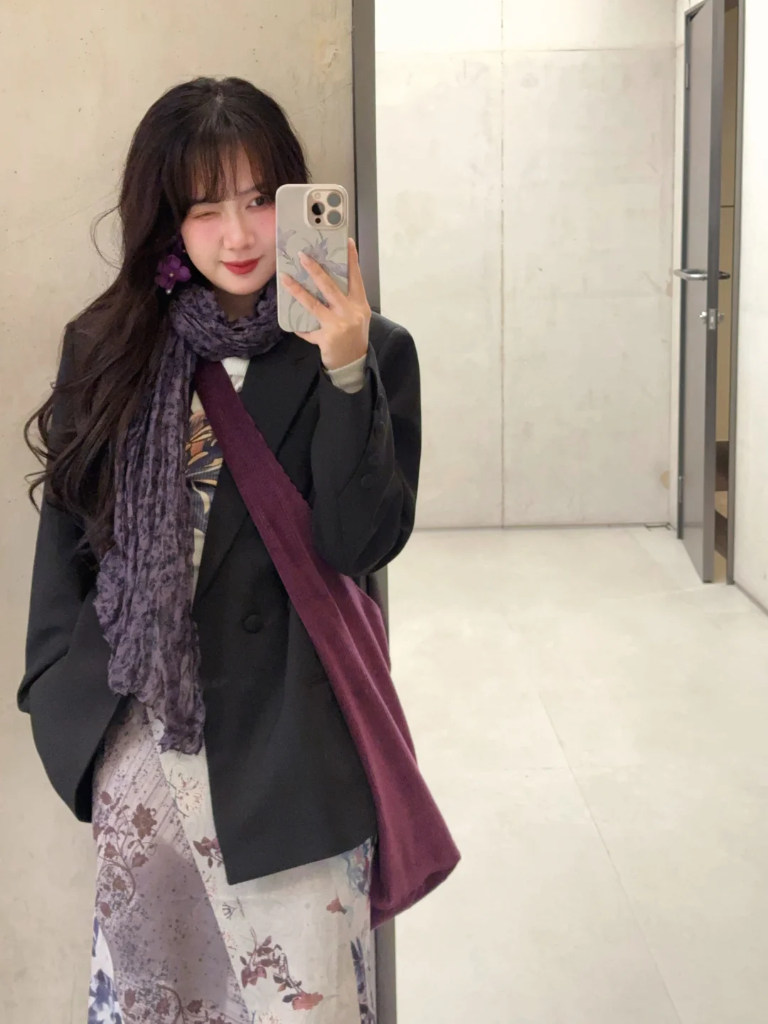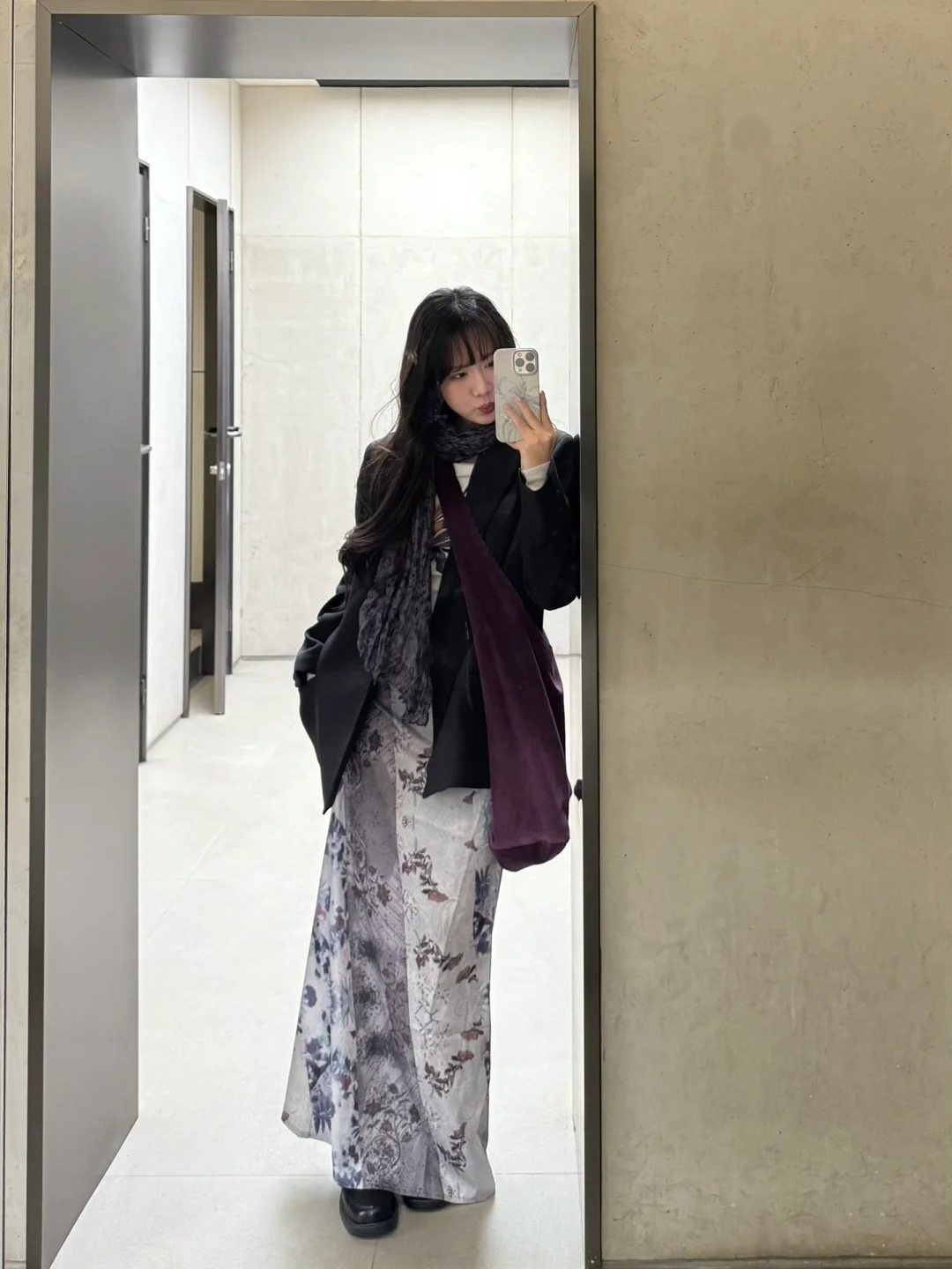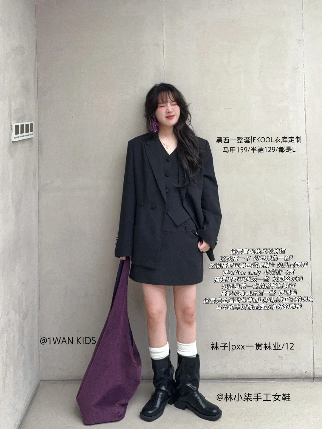 168/106左右 黑色西装的一期新的穿搭思路 紫色系➕艺术系➕风格化穿搭 属于有点调调但不会不日常那种 黑西有无限可能 真的 这件外套我上一期搭配裤子比较多 喜欢裤子的姐妹可以参考上一期~