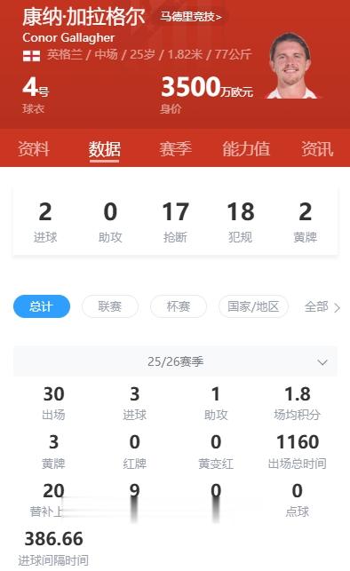 加拉格尔在2024年从切尔西加盟马竞,本赛季为马竞出场30次,有3个进球。