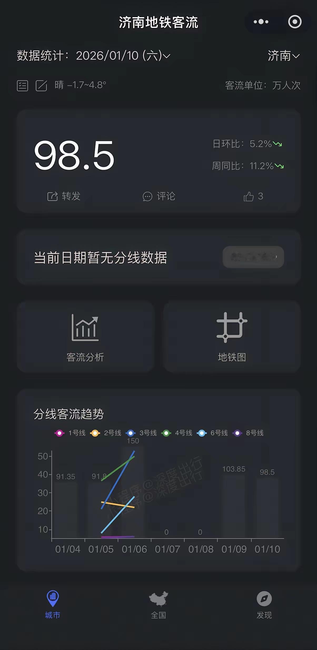 济南地铁客流量已经稳定在100万上下。 目前济南新开通的地铁线已经运行了半个月左右,客流量也逐步稳定了。现在看来,未来一段时间内济南地铁客流量在百万人上下。 2025年最后几天的客流量主要是图新鲜,2026年元旦客流量爆发也有节假日因素。元旦结束后,客流量就降低到90万左右。 现在这几天客流量又恢复了一些,目前已经稳定到100万左右,1月9号是103万,1月10号是98万。按照这个数据来计算,客流强度在0.55左右。和第三轮审批要求的客流强度0.7相比,有一定的差距,但又不太远。 好好培育客流,有必要的话减少甚至取消117、115、202等经十路公交大线,这样既增加了四号线的客流,也减轻了经十路地面交通压力。