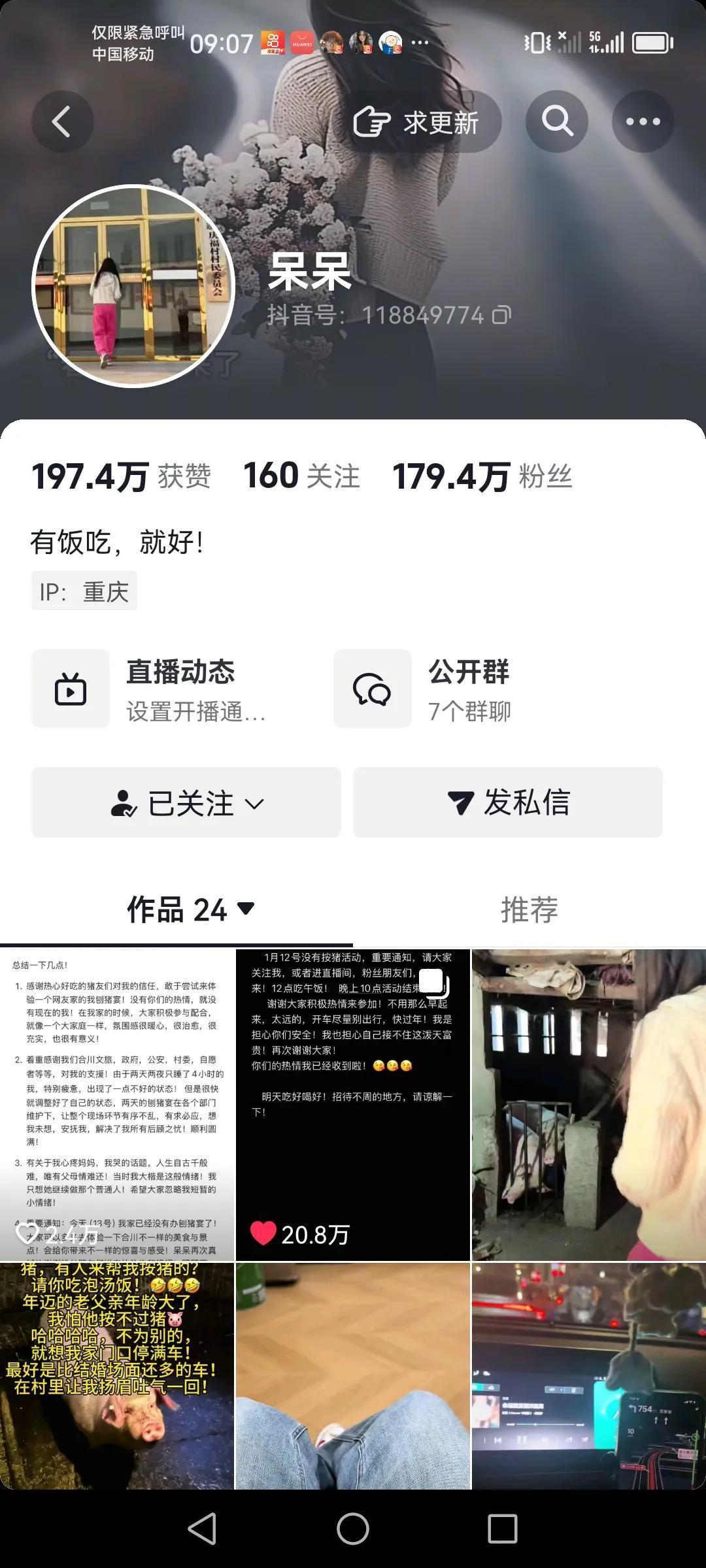 这泼天的富贵,流量 这是全国人民的心声 呆呆妹妹因为一条邀请在城里打拼的,说白一点就是没有家人陪伴的单身的等(孤寡),呆呆家里的这种善良淳朴的爸妈,也是我们家农村人的爸妈,引起了共鸣。 一秒钟都可以让呆呆成为了十万,百万的收入都有了,直播间一直十万加,抖音一号,飞机,各种礼物不停的飘,9999加的礼物,信息等,是谁包括我都会呆,吓呆了,全国各地的人们都在往呆呆家赶,她们村子的人们也都是头一次见到这仗势。当地的村委,镇上,合川县文旅部门,公安,交警,都出动了,一起迎接这泼天的富贵,前天晚上还在她们家田里点起了火堆,现场人是太多了,院子根本容不下。现场的一首刀《谢谢你》的大合唱,唱出了现场所有人的心,也是直播间十几万几十万人的心,全国人民的心,我们用这种方式去感谢感恩,这都是我们大家的共鸣,呆呆的粉丝也是从三天前的几百直接到一百七十多万,还在不停的涨。甚至还有网友建议合川,以后每年1月11日定名为合川刨汤节,全国人民的团圆节,因为1月11日相加就是合川后面的一个川字呢!希望呆呆妹子一家以后的日子都红红火火,合川人们也红红火火,全国各地的人们的日子都红红火火,这是对大家的祝福!以上仅供参考,属个人意见!呆呆自拍 网红呆呆妹 呆呆视频