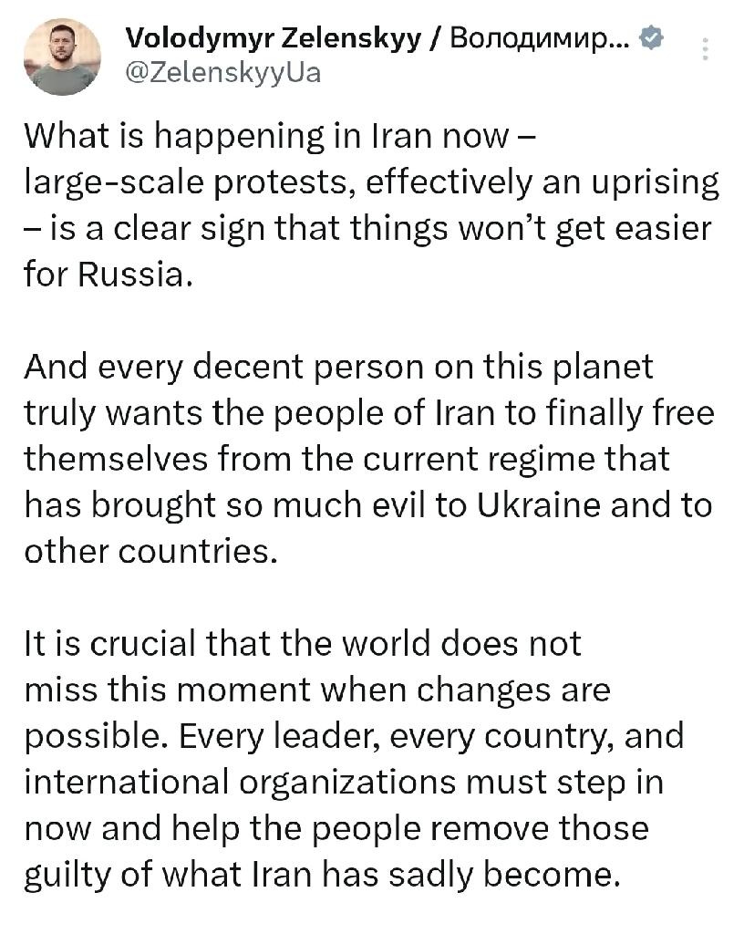 1月13日,泽连斯基发文:“伊朗当前大规模抗议实为起义,我认为此事折射俄罗斯处境难好转,有良知者都盼伊朗民众推翻现政权,该政权给乌克兰及多国带来深重罪恶,世界不可错失伊朗变革良机,我们敦促各国、国际组织及各界领导人立即行动,助力伊朗民众铲除致国家深陷苦难的罪魁祸首,一切皆有改变可能!” [机智]泽连斯基操心伊朗:先顾好自家烂摊子再当“国际法官”!这番喊话让人迷惑,自家战火纷飞、民生凋敝,却有空给伊朗局势定性喊起义,还扯出俄罗斯,算盘打得全球都听见!忘了当年靠西方援助续命的窘迫?如今倒教各国做事,要求国际社会出手伊朗,殊不知他国事务轮不到外人指手画脚,伊朗问题根源复杂,岂是几句嘴炮就能定性?更讽刺的是,他骂伊朗政权“造罪恶”,却对西方拱火俄乌冲突、本国腐败丛生视而不见,一边盼着伊朗变天牵制俄罗斯,一边想借此事蹭关注度要援助,老戏码换汤不换药! 有评论表示,与其当远程“键盘侠”指点江山,不如回头看看乌克兰民众的生存困境,少些投机算计,多些务实举措,别让嘴炮成了治国唯一本事!