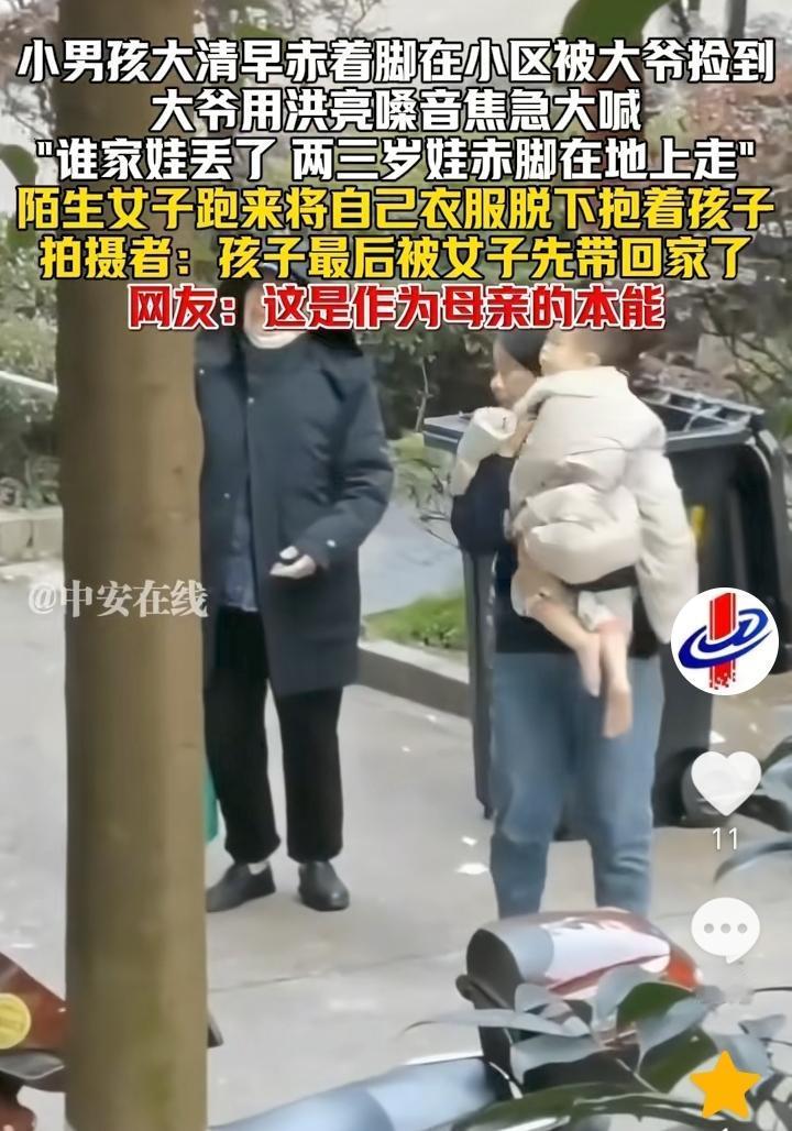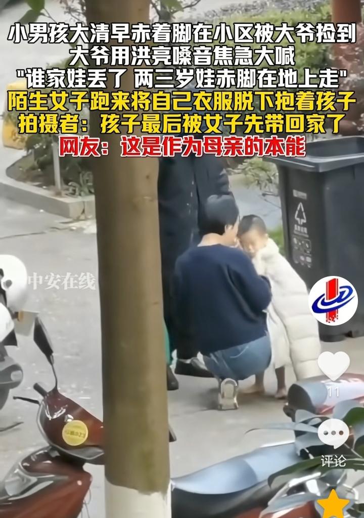 “谁家孩子丢了?”湖南,大清早一小孩穿着睡衣光着脚在小区楼下被一大爷发现,大爷拉着小孩在小区大喊“谁家孩子丢了,两三岁娃赤脚在地上走”,一陌生女子注意到了大爷和小孩,急忙上前脱掉自己的外套给小孩取暖,然后直接把小孩抱了起来,看没见家长来认领,女子就直接先把小孩带回了家。 大早上身穿睡衣还光着脚,小孩这很明显就是早上起床直接就跑下了楼,天冷孩子这样是很容易感冒的,热心的大爷捡到小孩后就大喊也没有人认领,女子的出现无疑是让人感觉到了温暖,她没有任何言语,直接用行动证明了同样作为母亲的本能。 小孩家长也是心大,孩子都跑楼下了也不见有人去找,不过有可能是家长外出忘了锁门,孩子才跑了出来,希望家长反应过来发现孩子不见了能及时联系女子去找回孩子。