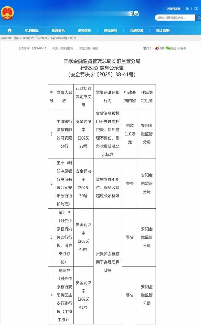 例如,安阳分行因“贷款资金被挪用于办理质押贷款、贷后管理严重缺位、服务收费超出公示标准”被罚款110万元,反映出信贷审批流于形式、资金流向失控、合规意识淡漠;南阳分行曾发生“员工挪用客户资金”事件,说明基层岗位权限管理混乱、行为监控机制缺失。
