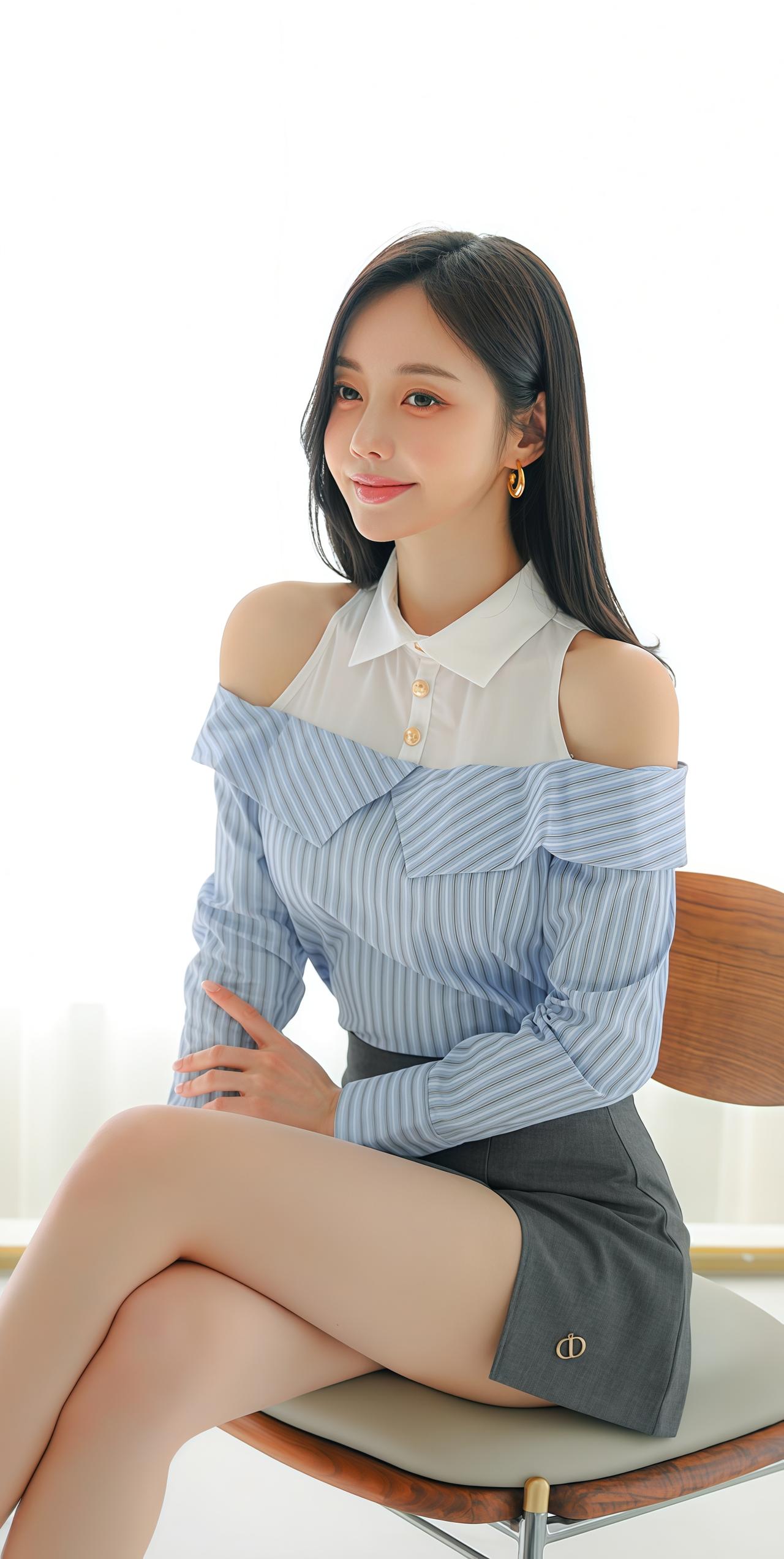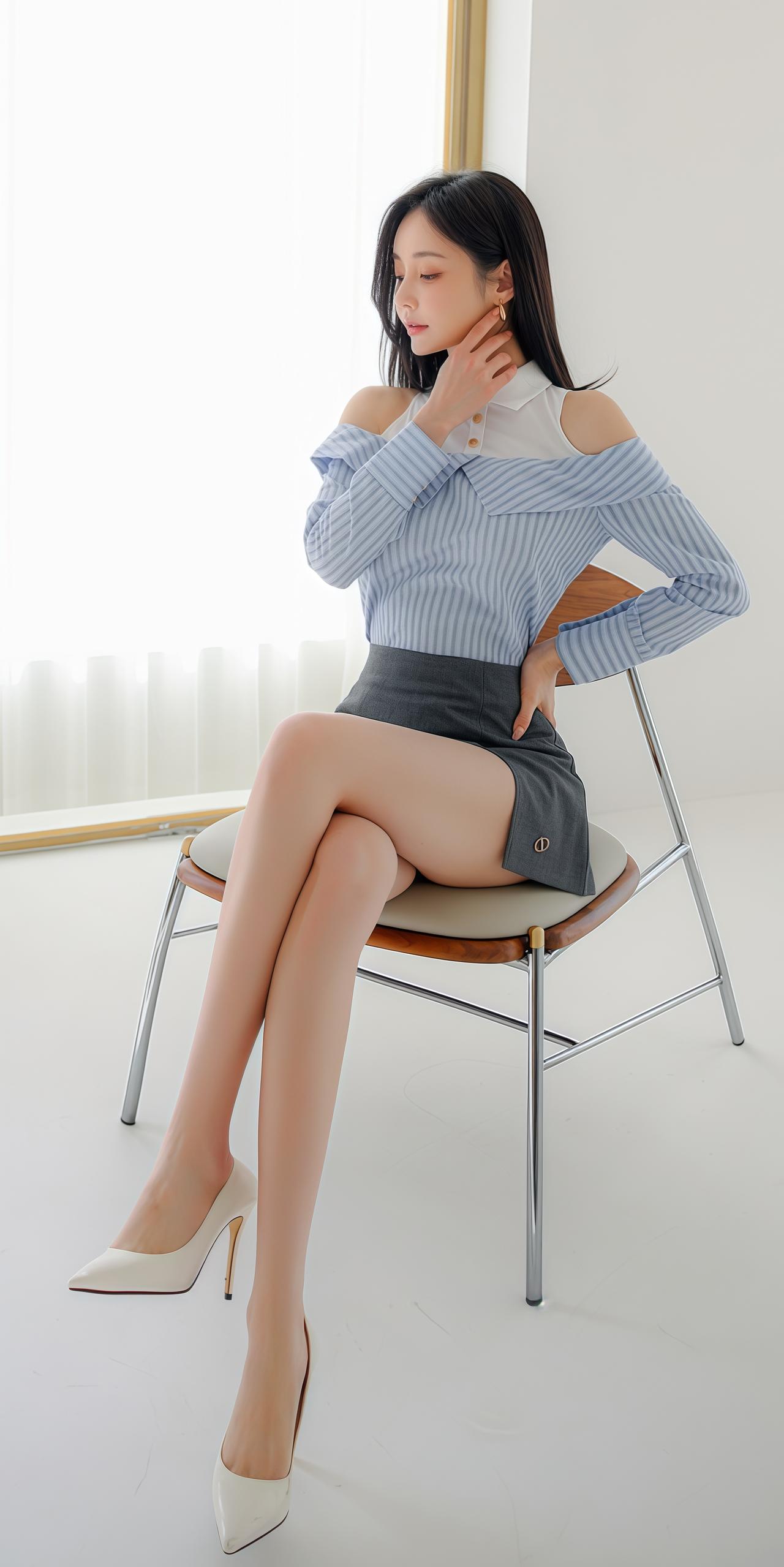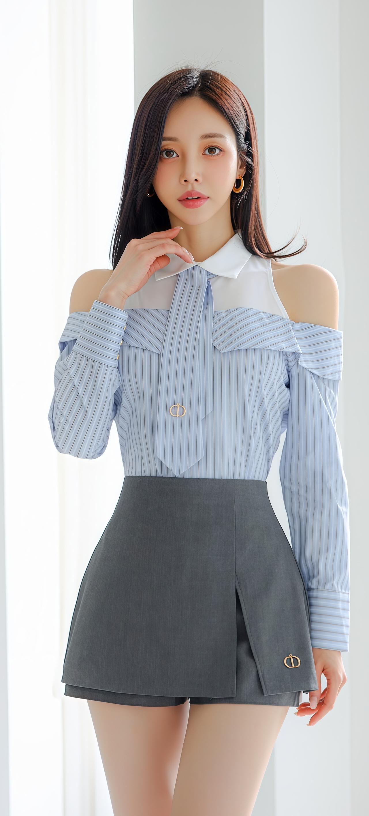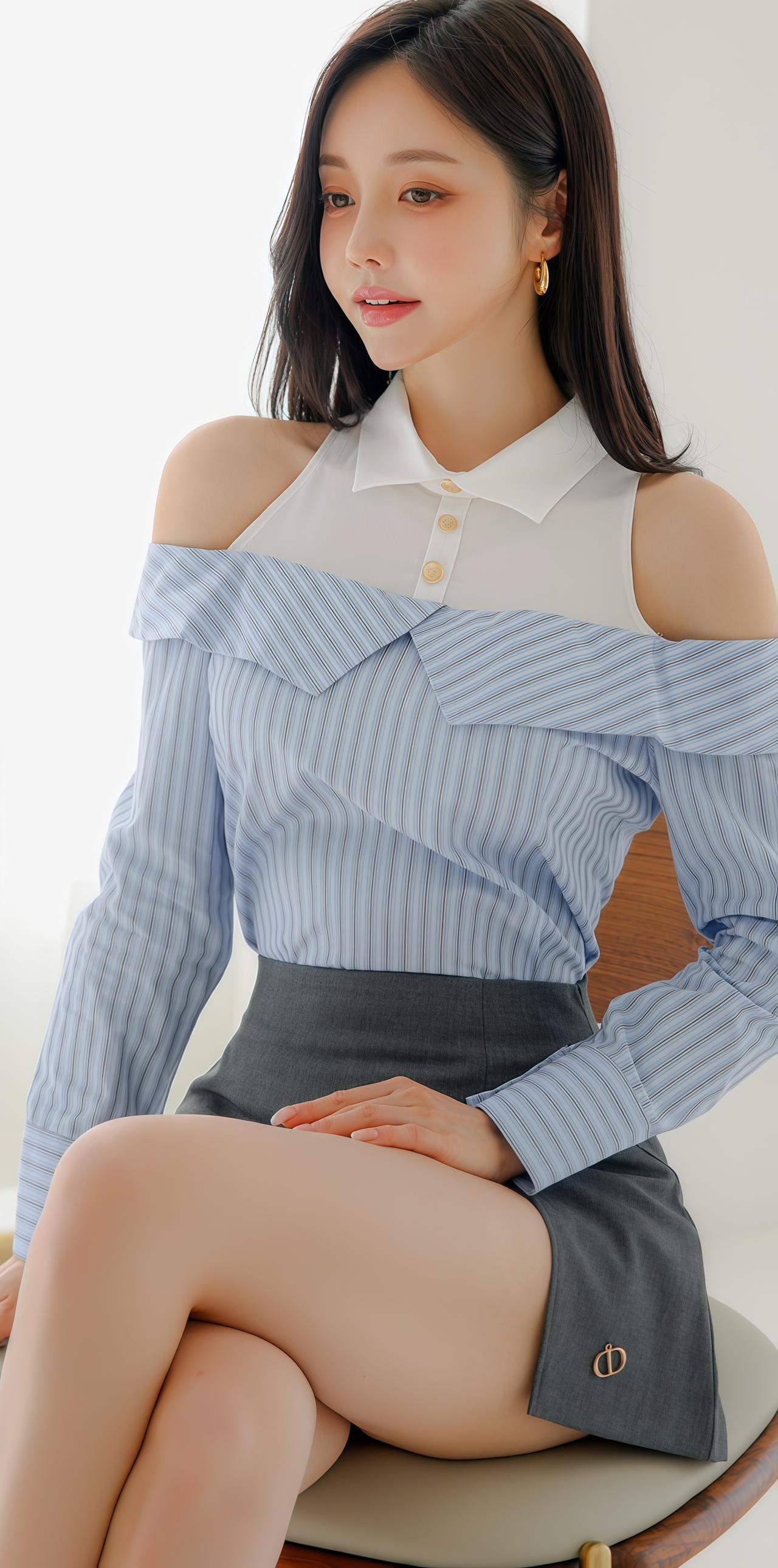 孙允珠优雅蓝白条纹露肩上衣搭配灰色短裙,尽显时尚气质!