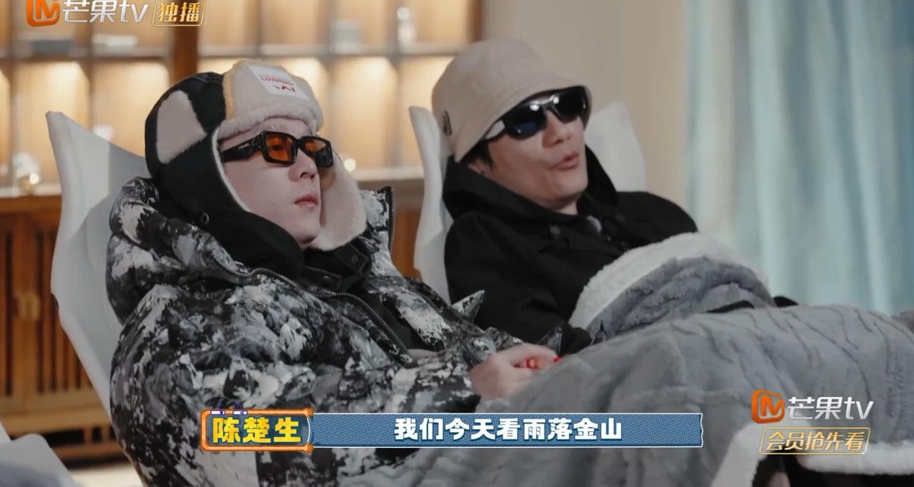 其他哥哥都忙前忙后, 只有陈楚生,王栎鑫 一动不动。 陈楚生他们6人和王霏霏,沈梦辰 来到酒店观景台, 想要看日出, 想要看到看到日照金山的美景。 但是天公不作美, 下起了小雨, 云雾久久不散去。 其他嘉宾都忧心忡忡, 苏醒抽象打电话, 张远抽象求太阳, 陆虎抬头喝露水, …… 各种搞怪各出奇招。 镜头一转, 王栎鑫和陈楚生 就静静躺在椅子上, 盖着大毛巾, 闭目养神。 陈楚生自嘲他们两个人 就像两个养老院的老人, 被推出去晒太阳, 忘记把他们推回室内了, 搞笑极了。 王栎鑫和陈楚生这两个人心态绝了, 别人都担心看不到日出, 他们就直接躺平, 爱咋咋地。 陈楚生淡定躺平很正常, 那么爱搞怪的王栎鑫那么消停, 就静静躺在那里, 太奇怪了。 这样看来他真的困了, 没有睡醒, 不然他早加入怪的队伍了。 这样看来真淡定的是陈楚生, 他似乎接受一切的安排, 随遇而安, 不纠结不内耗。 他强调没有看到日照金山, 看到雨落金山也挺好。