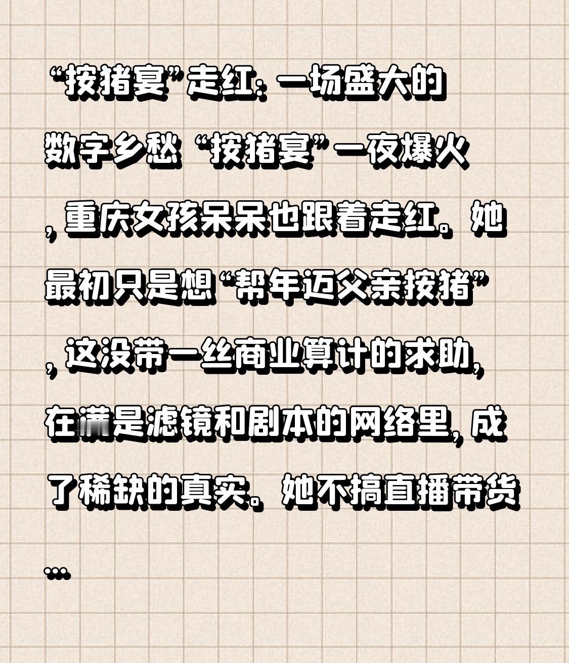 “按猪宴”走红:一场盛大的数字乡愁 “按猪宴”一夜爆火,重庆女孩呆呆也跟着走红。她最初只是想“帮年迈父亲按猪”,这没带一丝商业算计的求助,在满是滤镜和剧本的网络里,成了稀缺的真实。 她不搞直播带货那一套,而是“请大家吃肉”,这份豪爽和耿直,让网友千里赴约。一个柔弱女孩面对流量时的手忙脚乱,还激发了大家的保护欲。 “按猪宴”能走红,更在于它戳中了大家的情感痛点。杀年猪是乡村年味的符号,可城市化让很多人远离了这种年俗。呆呆的求助,就像一扇窗,让大家重温了那份团圆与温情,这或许就是盛大的数字乡愁吧。