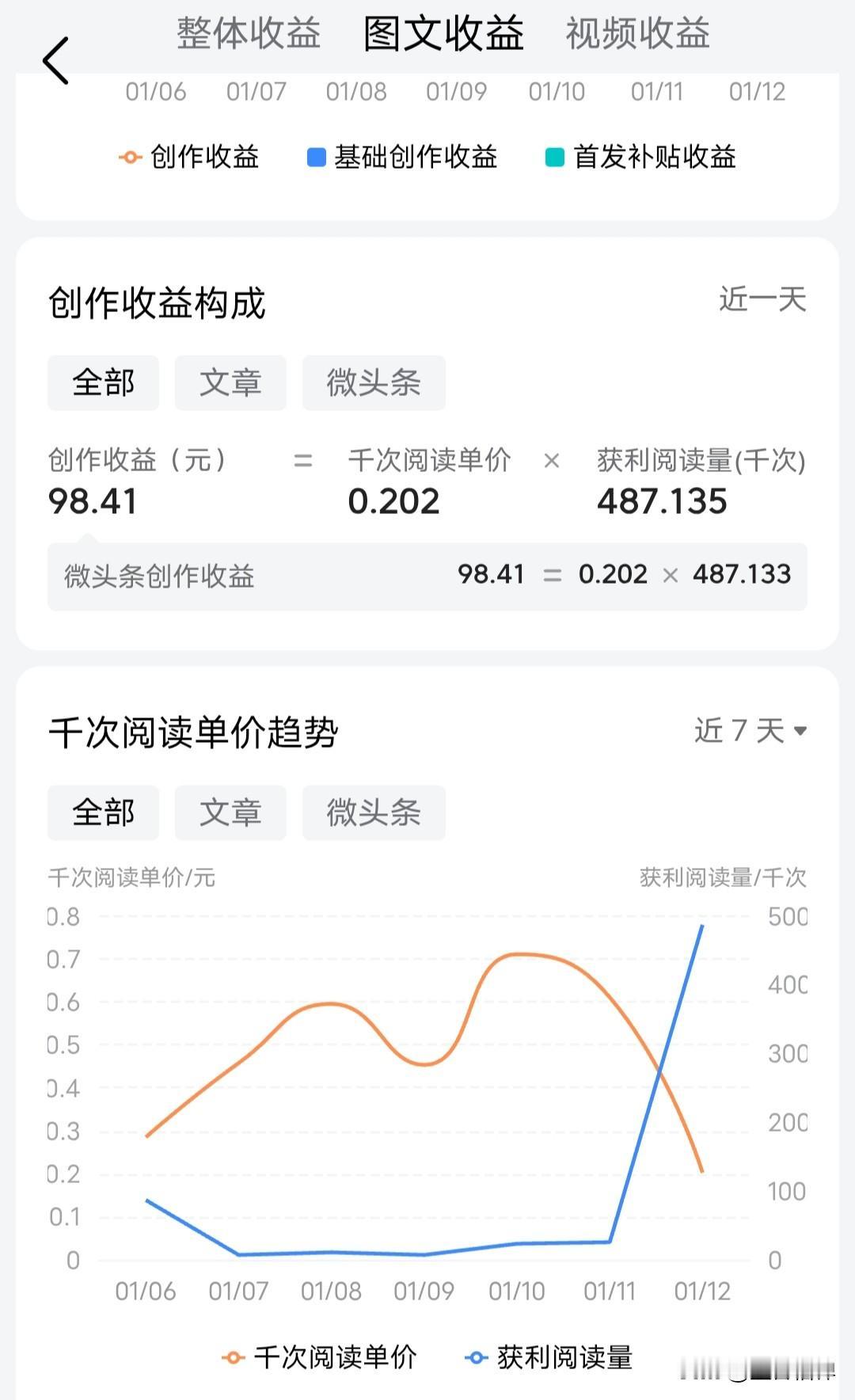 现在头条收益怎么这么低呀,一个爆款的微头条152万展现,48万阅读,7200多点赞,600多评论,收益才98.41元。单价竟然是千次阅读才0.2元,简直是低的可惜。 本来想着这个爆款今天应该收益不少,预计有200多,没想到是这个情况,今天加上视频收益4.35元,一共才102.76元。 以前十几万阅读都有100多块钱,看来现在想在头条上赚钱,实在是太难了。 大家最近收益都怎么样?