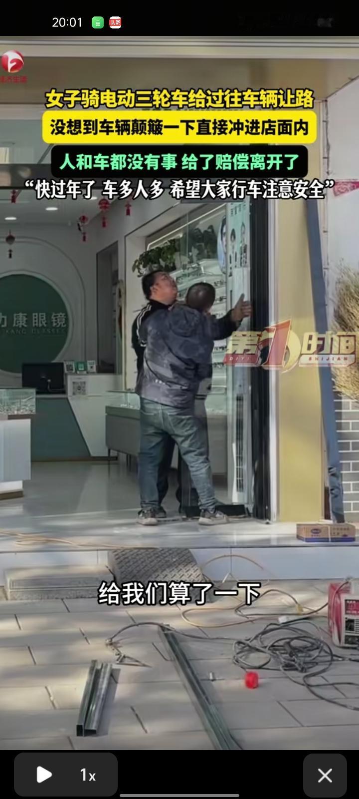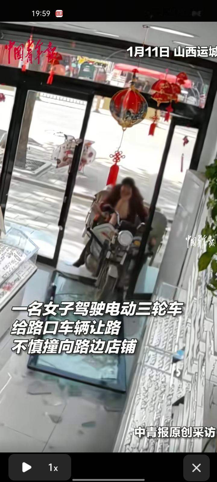 1月11日,运城市临猗县。一女子驾驶电动三轮车给路口车辆让路,不慎撞向路边店铺,玻璃门碎了一地,店里的人满脸震惊。好在人和车都没事,门和储物柜维修总共赔偿920元,她给了赔偿就离开了。店主表示,快过年了,车多人多,希望大家行车注意安全