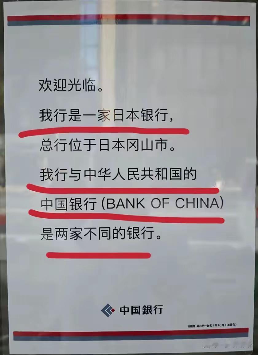 日本中部地区称为"中国地区",就是国家中部地区。 因为日本有所中国银行,与我国的中国银行不是一回事儿。 这张照片很久之前就有了,是因为有太多中国人上错门所以才这样。 提醒大家注意,有个别银行职员就是以此为难刚来日本的中国人,不提供业务服务,不管你怎么说,她们就说她们不是中国银行。 不过,从另一方面来说,中国文化对日本的影响还是很深的,汉字日本仍在使用。不过日本是白眼狼,学习中国文化,反过头来侵略中国。真是头凶残的恶狼,不得不防啊!