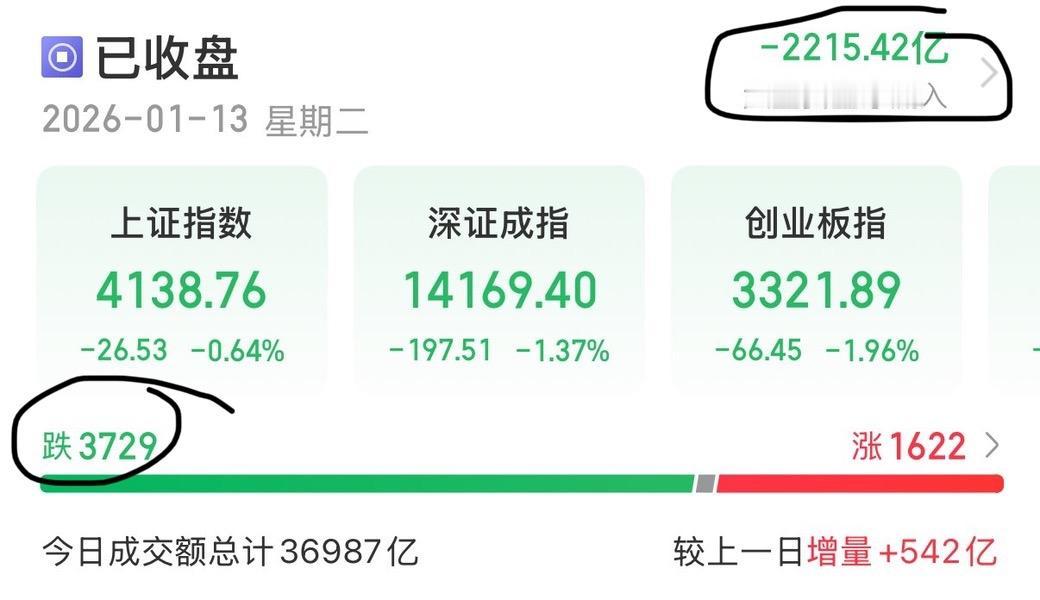 今日沪指没有18连阳,但是17连阳是33年来最长的连阳,很荣幸,我们都是见证者! ……………………………. 今日36987亿元的成交额较上日放量541亿元,创了历史最大成交额。 今日3729家下跌,算是“天量普跌”吧! 截至2026年1月12日,A股市场两融余额约26741亿元,进一步创出历史新高。 截至1月12日,两融余额占A股流通市值的比例为2.56%,但离历史高峰期仍有很大距离。 两融余额占A股流通市值的比例的高峰期出现在2015年5月至2015年7月间,当时一度超过4%。 ……………………………………….. 今日收盘,大盘资金净流出达到2215亿元(看下图)创下单日净流出历史记录! 没有“永远上涨”或“永远下跌”的股市,牛市从来不是直线冲天,而是一波一波往上拱。 这次,调整是为让“春季行情”走的更稳更远! ………………………….. 从大盘均线走势看,沪指的第一支撑位是5日均线4118点; 第二支撑位是10日均线4059点; 第三支撑位是20日均线3981点。 ………………………….. 长线仓位继续持股收息! 短线仓位操作策略: 涨多了,卖一点; 跌多了,买一点。 不涨不跌,就拿股息吧! 投资就是这么简单! ……………………………………