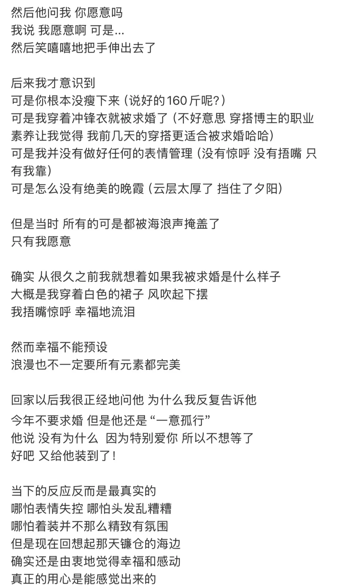给的家人们汇报一下这个好消息~ 恋爱八年终于被求婚啦!! 完全没想到 我总以为会是明年哈哈哈 但是一切就这样自然而然发生了 很意外但是欣然接受 小作文已经在🧣发过啦哈哈哈 记录下了此生最难忘的一天之一 “求婚不应该是只有男生在自我感动的盛大表演,不应该用人群和亲友让女生感到束缚。” 谈恋爱的时候我就说 如果求婚 想要两个人独处的时候 没想到被默默记下然后实现了 只属于两个人的海边 安安静静的 听着海浪翻涌的声音 说出一句 我愿意 浪漫不一定要完美的场景 幸福也无法提前预设 当下即为最好 很感动很知足很幸福! 希望大家都可以找到幸福🥰 ˗ˋˏᰔᩚˎˊ˗