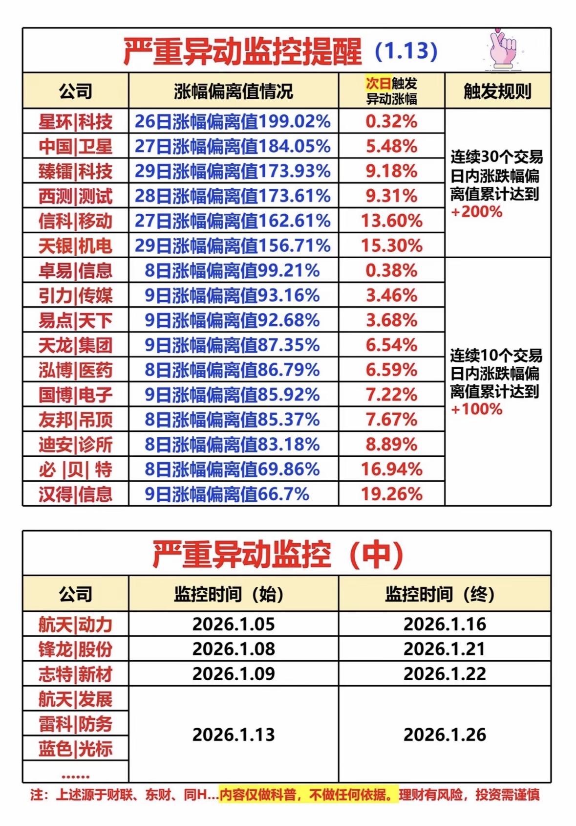 严重异动监控提醒 股票异动预警,投资需谨慎! 多股异动涨幅超100%,星环科技、中国卫星领涨,市场波动显著,投资需谨慎。 多股异动监控:星环、中国卫星等涨幅超常触发预警,投资需谨慎。