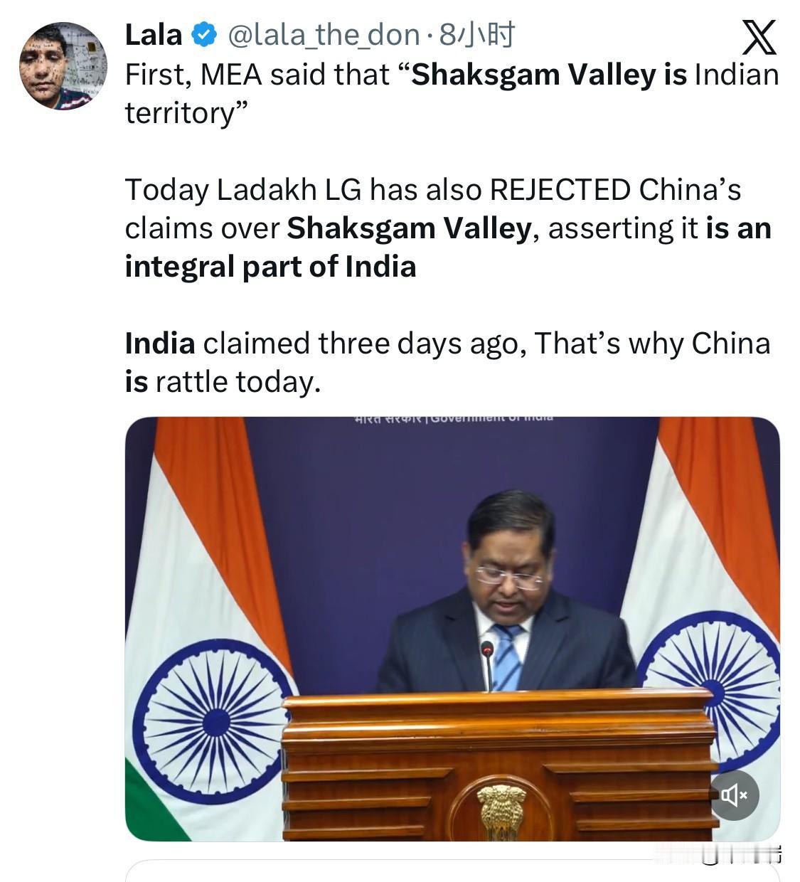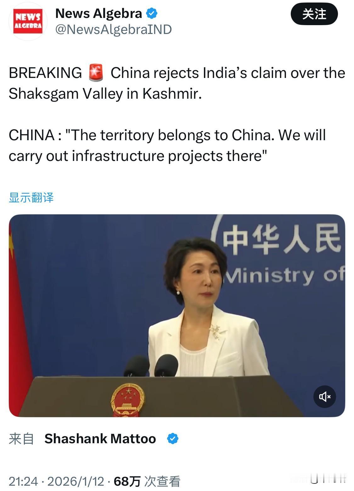 突发新闻:中国外交部发言人驳斥印度对克什米尔沙克思干谷的主权声索。 中国:“这片领土属于中国。我们将在那里开展基础设施建设项目。”