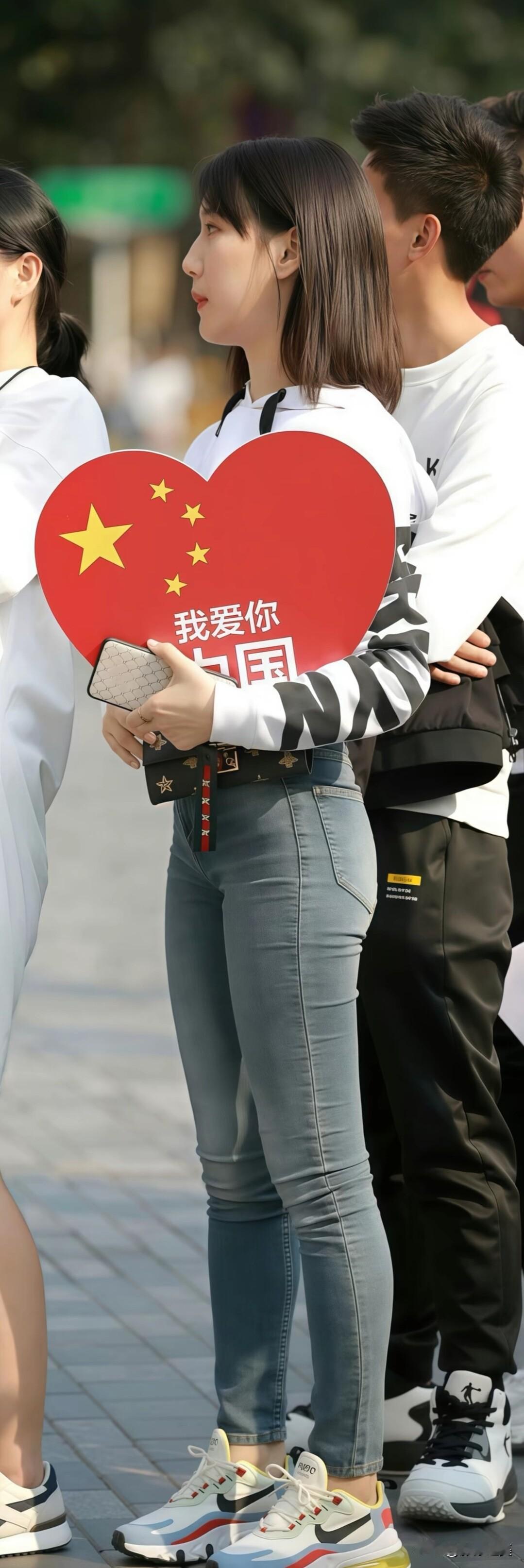 简约白卫衣+牛仔裤的清爽穿搭,手持“我爱你中国”红心牌,用青春活力为祖国打call🇨🇳