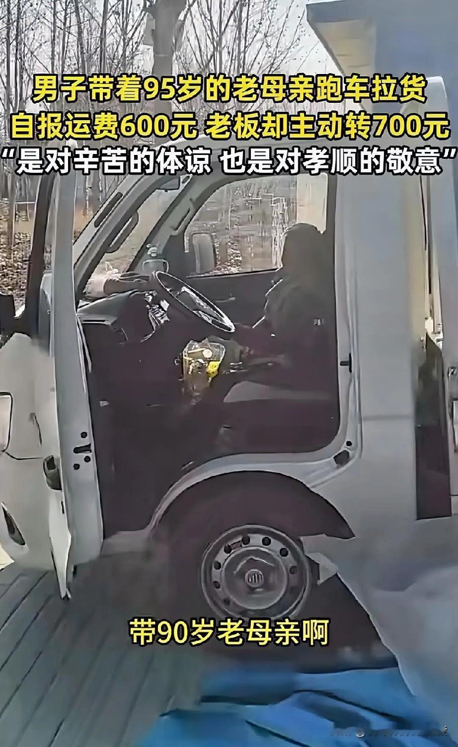 男子给一位老板拉了一车货,老板问他运费多少,男子说600,没想到老板给了他700。之所以这样做,主要是因为老板发现驾驶室内坐着一位老人。 一问才知道,这是男子95岁的老母亲,和儿子一块过来送货。 老板也是个孝顺之人,看到这般情景后,深感男子的不容易,索性就多给了100,算是对这份孝心的认可吧。 让老母亲跟自己一块颠簸着来回奔波,不是到万不得已,男子肯定不会这么做的。 一则可能家里除了男子没其他人照顾,二则可能怕老母亲孤单,带出来也算是散散心。 不管是哪一条,都足见男子对母亲的那份实实在在的爱,实实在在的回报,无论走到哪里,儿子都在身边。 希望老人家健康长寿,不要觉得自己是一个累赘,您在,儿子才能心安,心安才能好好干活。 大家说是吧? 内容来源:观象视频 山东聊城