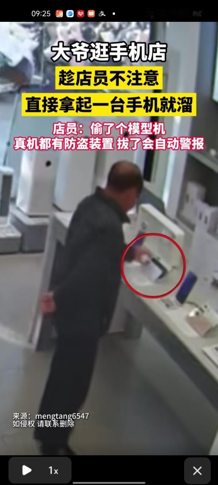 1月9日,周口项城市。网友晒出监控视频,一位大爷逛手机店,趁店员不注意直接拿起一台手机就溜。好在他偷的是模型机,真机有防盗装置,拔了就会触发警报,模型机肯定用不了。
