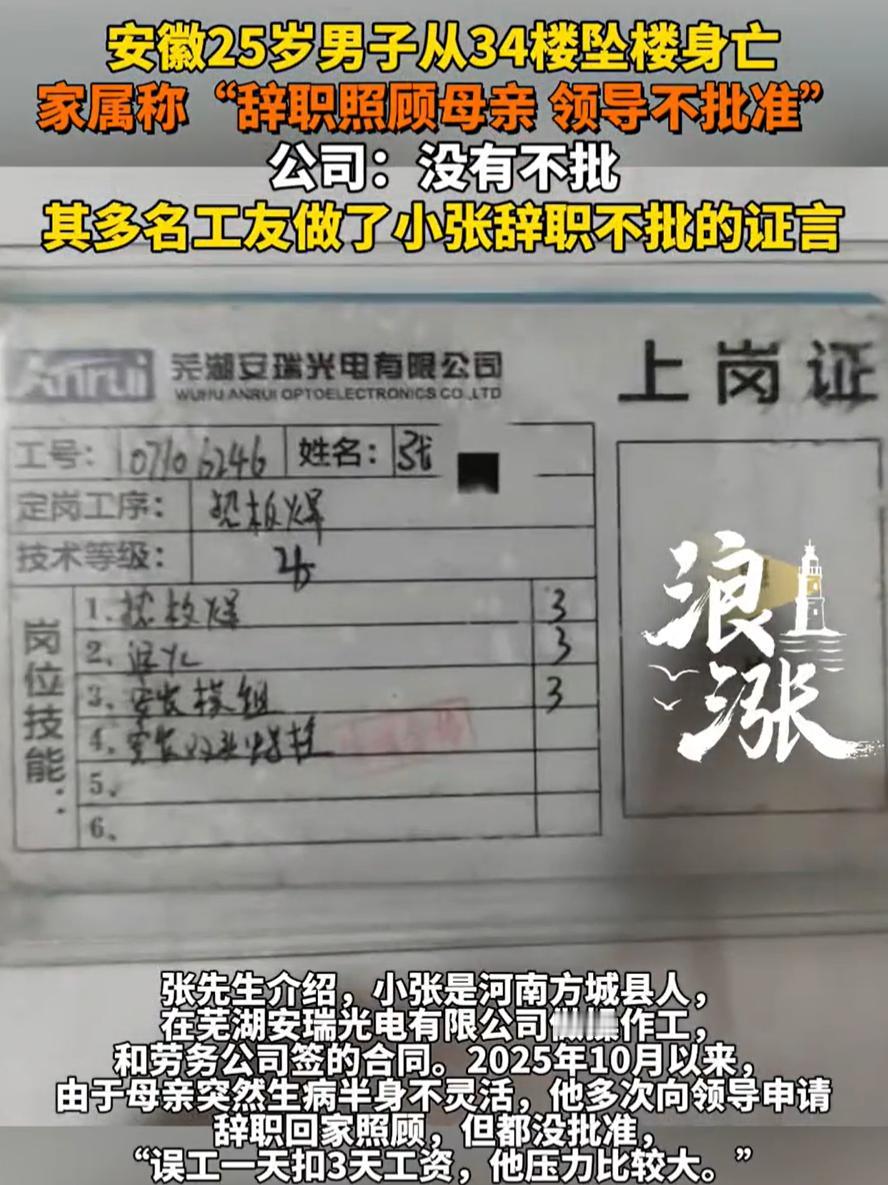 一片唏嘘啊!安徽芜湖,一位25岁河南小伙得知老妈在家里半身不遂,就想着请辞回家,结果却被公司拒绝,还说旷工一天要扣3天工资,小伙一时想不开,竟然从34楼一跃而跳,网友:为啥就想不开呢? 据小伙家人介绍,他是从方城县走出来的,本来正年轻,人生才刚刚开始。可老家突然传来消息,他母亲生病了,半身不遂,半边身子都僵硬麻木,行动不能自理 小张是家里儿子,知道这个消息后,人在外地,心早就飞回去了。他想照顾母亲,怕留下“子欲养而亲不待”的遗憾 但现实问题摆在这里,辞职回家,工作就没了,收入断了,生活怎么办?不辞职,母亲没人照顾,自己在外打工也不安心 几番挣扎,小张还是决定辞工回家。没想到,他向公司多次提出辞职,上司就是不同意。公司方面还说,如果旷工,一天要扣三天工资 小张一时想不开,竟然从34楼跳了下去。等警方赶到,调查后排除了他杀的可能。一条年轻的生命,就这样结束了 家属认为,小张的死和公司不准辞职直接相关,要求公司承担责任。有工友愿意作证,说小张之前确实多次请辞都被拒绝 有网友说:死都不怕还怕什么,大不了一走了之,现在家里老人怎么办 这句话听着简单,其实站在结果上说话容易。对一个普通打工人来说,规则、工资、违约、扣钱,这些东西长期被放在心里,慢慢会被当成不可逾越的红线。尤其是没太多社会经验的年轻人,很容易把一份工作看成全部退路。一旦这条路堵住,就会觉得前后都是墙 其实类似的情况不少见。很多在外打工的人,家里一旦出事,就面临两难选择:是要工作,还是要亲情?有些公司管理制度缺乏人情味,只讲规定不讲情理,把员工逼到墙角 法律上,员工提前三十天书面通知就可以解除劳动合同,这是劳动者的权利。但现实中,很多打工者不懂法,或者公司故意施压,导致他们不敢坚持自己的权益 这件事最让人心疼的地方在于,他并不是想逃避责任,恰恰相反,他是想扛起责任,却不知道怎么扛。他想当儿子,又怕当不好员工。他想尽孝,又怕没饭吃。左右为难到最后,选了一条谁都不愿看到的路
