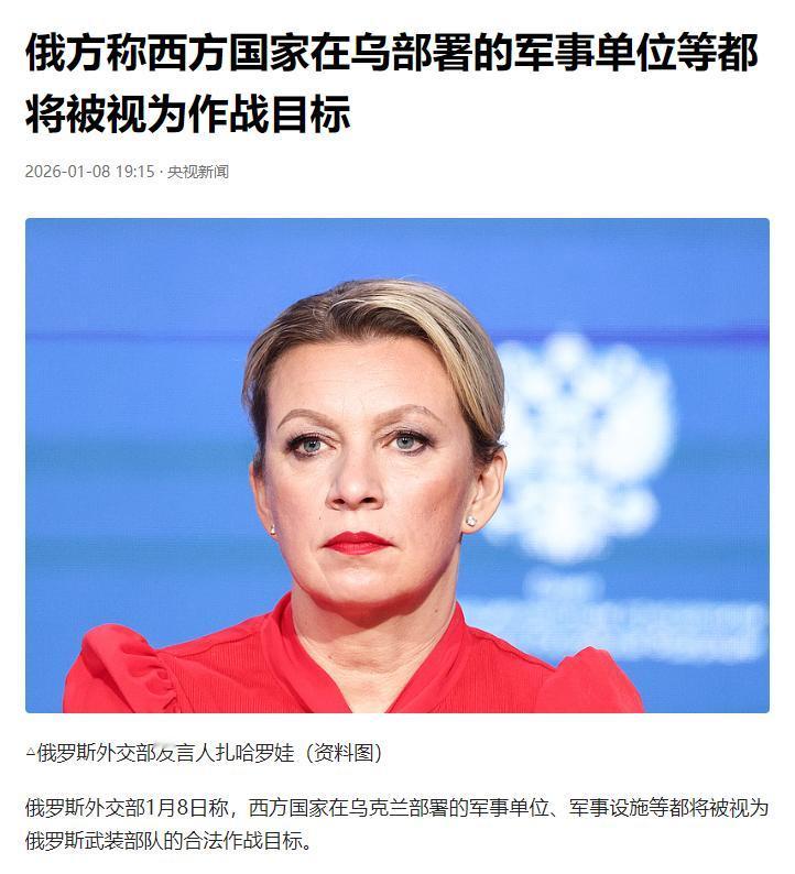 俄罗斯那个女发言人扎哈罗娃,算是彻底把桌子掀了。 她对着全世界的镜头,一字一句,清清楚楚地讲:所有在乌克兰的西方军事设施、武器仓库,甚至是人员单位,全部都是俄军的合法打击目标。 这句话不是随口的情绪宣泄,这是俄罗斯外交部1月8日的正式表态,扎哈罗娃的发言直接刊登在俄外交部官网,字字都带着官方定性的重量。 这一表态的直接诱因,是西方近期在乌克兰问题上的步步紧逼。1月6日,英国和法国牵头的所谓“志愿联盟”,在巴黎和乌克兰签署了一份安全保障宣言。这份宣言压根没提推动和平解决冲突,核心内容全是军事化升级的安排。 宣言明确写着,“志愿联盟”成员国要在乌克兰领土组建并部署多国部队。这些部队的任务很明确,战事停止后帮着重建乌克兰武装部队,还要长期在当地形成对俄罗斯的遏制。同时,文件还敲定要推进乌克兰和北约军工体系的深度融合,相当于把乌克兰彻底绑上西方的军事战车。 俄方直接把这个“志愿联盟”和乌克兰定性为“战争轴心”。扎哈罗娃在评论里说得很明白,西方这套计划根本不是为了持久和平,而是要持续推进军事化,把冲突进一步升级扩大。 很多人可能觉得这只是俄方的口头警告,但事实是,俄罗斯的警告早已多次在最高层面重申,而且已经用实际行动证明了决心。就在扎哈罗娃表态后不久,1月9日凌晨,俄军就发动了大规模空袭。 俄军出动了36枚导弹和242架无人机,精准打击乌克兰境内的关键目标。其中,10马赫速度的“榛树”高超音速导弹首次在利沃夫战场现身,直接击中了这座距离北约边境不足70公里的补给枢纽。这座枢纽是西方援乌物资的重要中转站,此前一直被西方视为相对安全的后方。 更早之前的1月5日,俄军已经精准打击了第聂伯罗市的美国邦吉公司石油加工厂。这座工厂承担着乌克兰35%的军用油料加工任务,打击直接导致300吨原油泄漏,严重影响乌军的油料补给。 西方在乌的军事存在,其实早就不是秘密。很多打着“军事顾问”旗号的美英人员,一直活跃在乌克兰境内。1月8日敖德萨的打击行动中,俄军导弹直接摧毁了北约军火船和乌克兰无人艇基地,有消息称造成8名美英军官死亡。对于这一损失,美方回应含糊其辞,英方也只敢承认有“培训顾问”存在,全程不敢正面回应人员伤亡情况。 扎哈罗娃的表态,相当于彻底撕破了西方的“遮羞布”。之前西方一直试图把在乌军事存在包装成“志愿援助”“技术培训”,规避直接参战的名义。现在俄方明确表态,不管这些存在用什么名义包装,只要是西方的军事单位、设施、仓库,都属于“外国干预”的产物,都将成为俄军的合法打击目标。 这一表态也让西方陷入了两难境地。英法此前高调宣布,要在俄乌达成和平协议后向乌克兰部署部队。现在俄方直接划下红线,这些计划中的部队一旦进入乌克兰,就会成为俄军的打击目标。 西方内部的分歧也因此进一步暴露。美国并没有签署地面部队部署声明,只承诺参与所谓的停火监测。特朗普政府甚至已经停止了一切对乌援助,搁置了两年8亿美元的军事援助方案,仅向乌交付了10枚防空导弹,与乌军日均应对空袭的需求相去甚远。 北约内部的矛盾也愈发明显。北约秘书长斯托尔滕贝格呼吁盟国解除对乌使用援乌武器的限制,却遭到意大利和德国的明确反对。德国总理朔尔茨直接重申,援乌武器有“明确使用规则”,禁止用于打击俄罗斯本土目标。 从冲突走向来看,扎哈罗娃的表态标志着俄乌冲突的博弈逻辑发生了重大变化。此前的冲突更多是俄方与乌克兰政府军的对抗,西方以“代理人”的身份背后支援。现在俄方直接把矛头指向西方在乌的军事存在,冲突从间接对抗向直接威慑升级。 俄军近期的持续空袭也印证了这一转变。1月13日,俄军再次发起第二轮大规模空袭,采用“无人机耗防空+导弹打要害”的复合模式,重点打击基辅、利沃夫等地的弹药车间、导弹零部件生产线及能源枢纽。军事专家分析,俄军此举意在通过持续消耗乌军防空弹药,同时精准摧毁其军工产能,削弱乌克兰的持续作战能力。 当前的局势已经很清晰。西方持续向乌克兰输送武器、部署军事力量,不断突破俄方的红线。扎哈罗娃的表态就是俄方的最终通牒,明确告知西方任何在乌军事存在都将面临直接打击风险。 2026年的寒冬里,乌克兰的能源设施已经濒临崩溃。西方的援乌分歧不断加大,俄方的打击力度持续升级。这场冲突的走向,因为扎哈罗娃的这一表态,变得更加扑朔迷离。和平谈判的窗口本就渺茫,现在各方的博弈,已经进入了更直接、更危险的阶段。