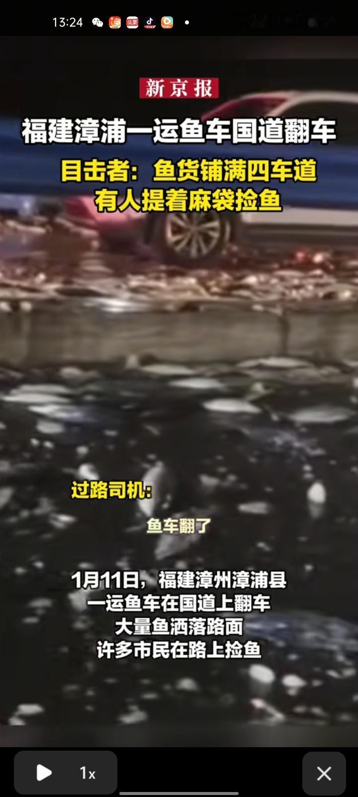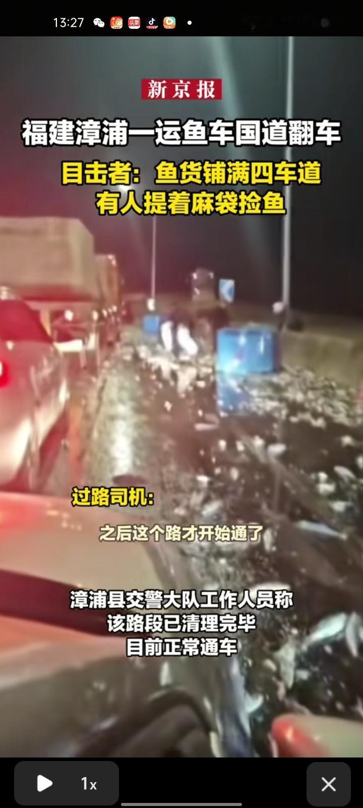 1月11日,漳州市漳浦县。运鱼车在国道上翻车,大量鱼洒落路面,不少市民在路上捡鱼。有过路司机表示,事发后鱼散落在四个车道,造成交通堵塞,有交警赶到现场维持秩序。 漳浦县交警大队工作人员称,该道路已清理完毕,目前已正常通车