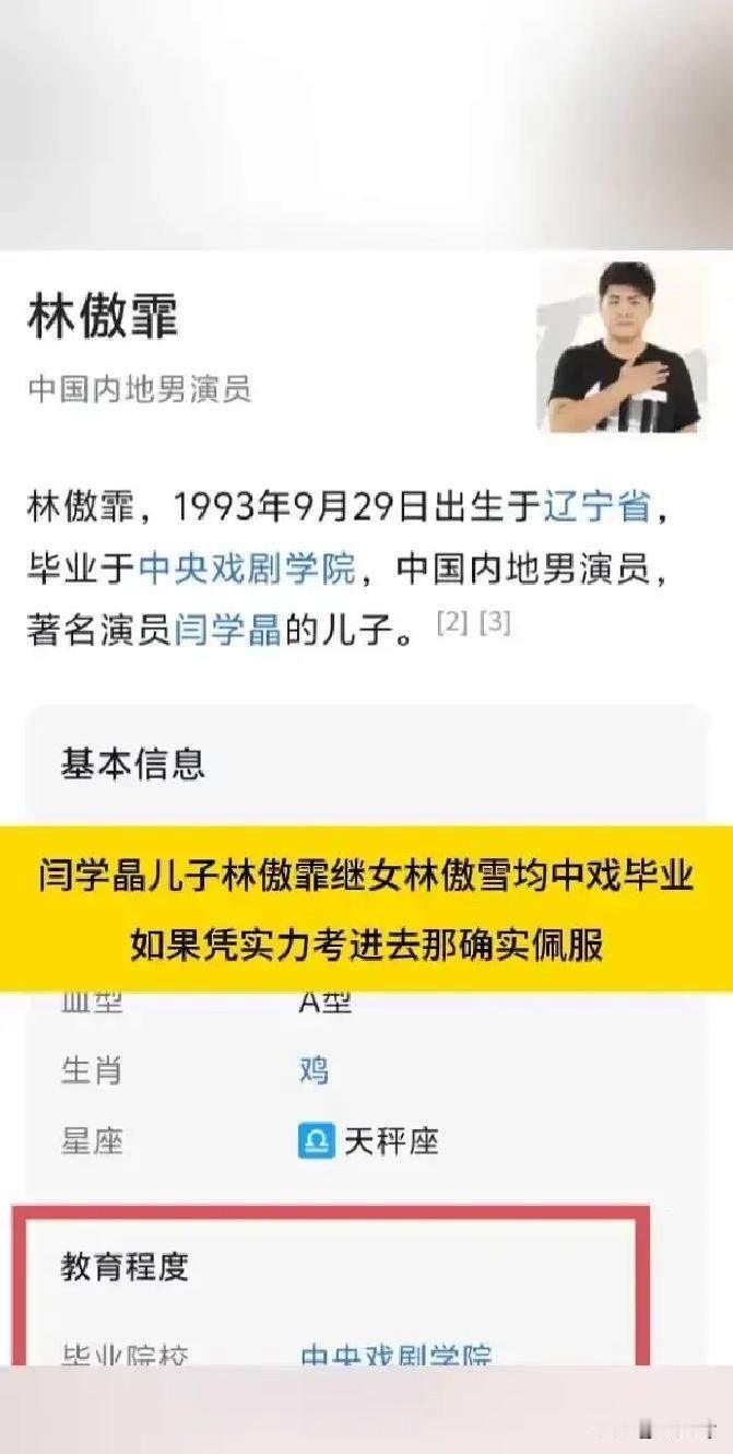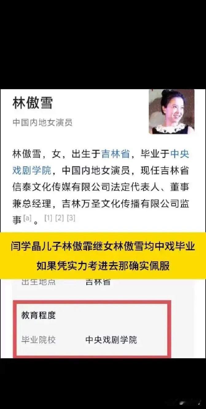 原来闫某晶的一双儿女都是中戏毕业!继女林傲雪和儿子林某霏,虽然同父不同母,但是他们姐弟俩都是中戏的毕业的! 一开始还以为闫某晶和前夫林越是结发夫妻,生了一儿一女,林傲雪和林傲霏都是闫学晶的亲生儿女呢!后来查了一下才发现并非如此! 真是一人得道鸡犬升天!平常百姓家孩子想考个好学校勘比登天还难!据说闫的侄子也是中戏毕业! 有人说闫学晶是好母亲,这话没毛病,俩孩子全送进中戏,估计连现在上小学的小女儿,估计以后也是奔着中戏去! 优秀的一家人!这一家人都能进中戏班,还没有违规操作!真是一切皆有可能!