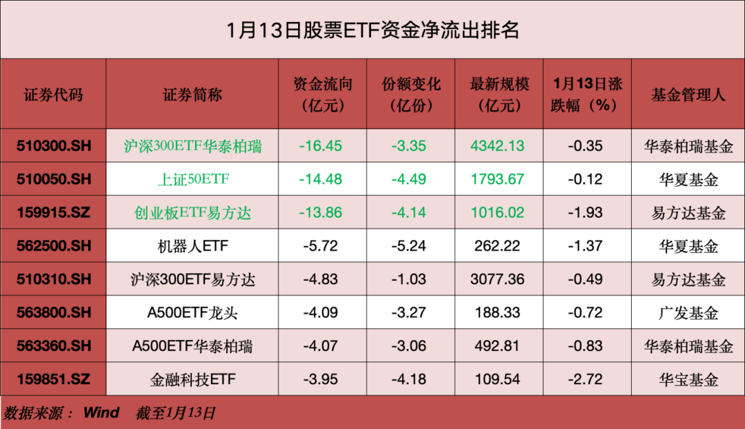 Wind数据显示,目前全市场1301只股票ETF(含跨境ETF)总规模达5.06万亿元。按照区间成交均价测算,1月13日股票ETF整体净流入资金达146.46亿元。