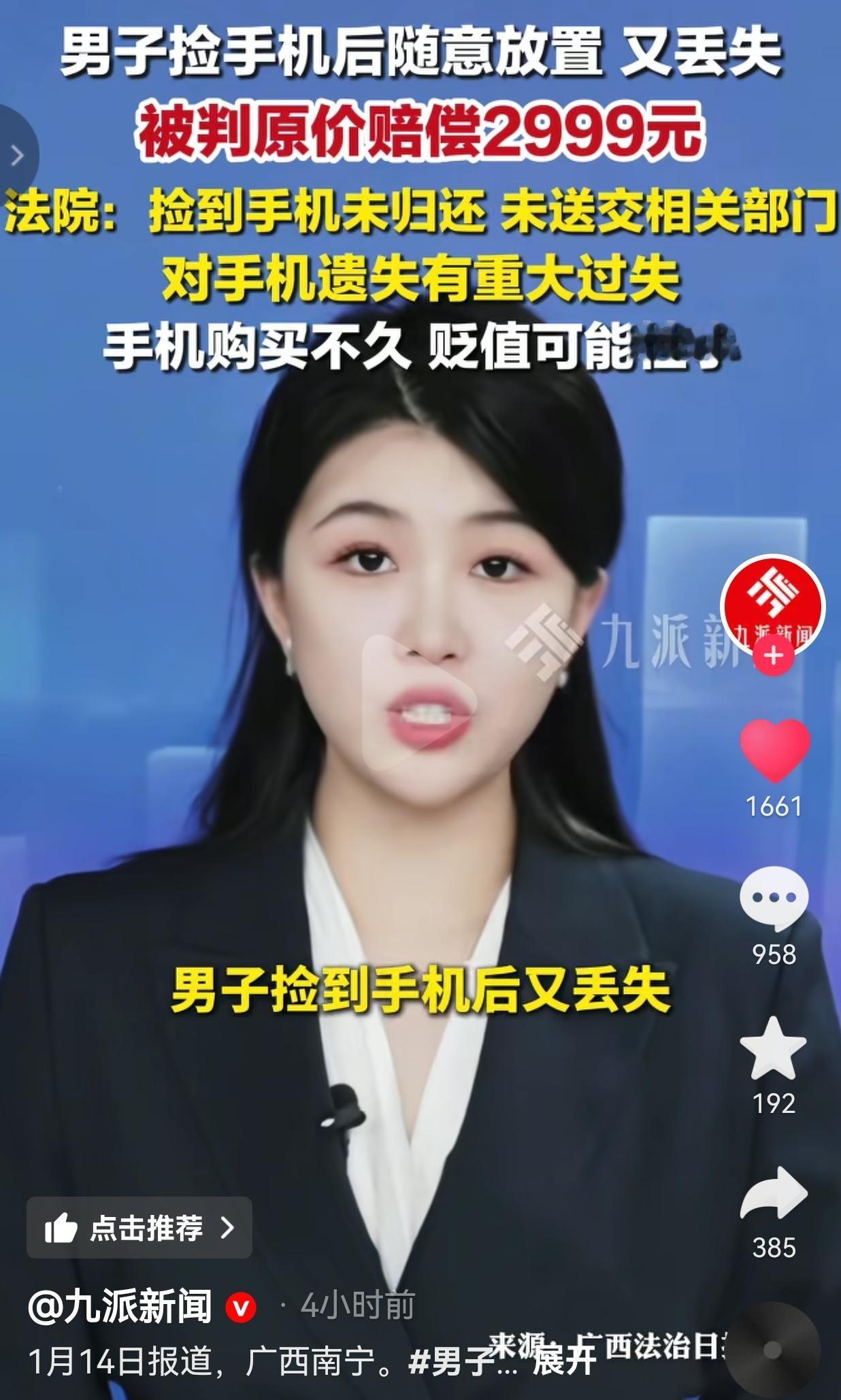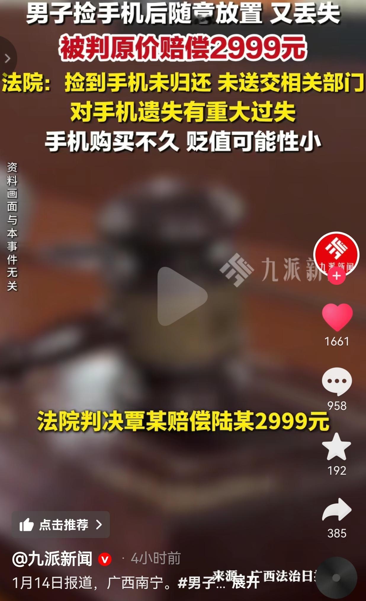 拾到别人的东西,一定要归还,别不当回事了,这就是血淋淋的教训!男子捡到手机后随意放又弄丢,法院判了,被判赔2999元!网友:法院的判决,给所有人提了个醒,不是自己的东西,千万不能任意处置。 根据九派新闻1月4日的报道,2024年7月,广西南宁,一市民陆某不慎遗失了价值2999元的手机,当时手机壳里还存放着失主的身份证。 陆某为了找到自己的手机,就选择了报警,后警方调查发现,手机被路人覃某捡走了。 经过询问,覃某承认捡到手机的事实,可是,他却声称当时喝了酒,随手把手机搁在车头屉桶内,之后就再也找不到了。 更让陆某气愤的是,覃某捡到手机后,明知道手机壳后面有身份证信息,而他并未联系自己,也没把手机交给派出所,这不是完全没把别人的财物当回事吗? 陆某一气之下,将覃某告上法庭。法院审理后认为,覃某拾得手机后未归还也未送交有关部门,还因这种随意放置的行为对手机遗失存在重大过失。 而作为遗失物的拾得人,他本就负有妥善保管并归还的法定义务,如今因自身过错造成财物损失,理应承担赔偿责任。 再加上手机刚购买不久,贬值空间极小,最终判决覃某向陆某赔偿2999元。 网友看到后评论说:“这判决太解气了!捡东西不还还弄丢,不赔他赔谁?” 还有的网友说:“喝了酒就可以随便放别人手机?该不会喝酒只是一个借口吧?他可能根本就不想归还,因此找了这个借口,这理由我都替他尴尬。” 通过这事也给所有人敲了个警钟:别把捡到东西不当回事,妥善保管、及时归还,既是做人的本分,也是法律的要求。 如果因为自己的疏忽造成他人财物损失,最终只能自己买单。而对于失主来说,遇到财物遗失也别慌,及时报警、通过法律途径维权,才能保护好自己的合法权益。 最后,希望大家都能守好道德和法律的底线,宁愿拾金不昧博个好名声,也不能因自己的一时疏忽让自己名誉受损,真的得不偿失!
