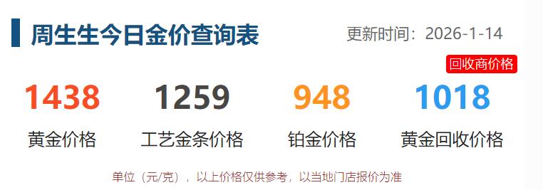 现在天气寒冷, 中午只能去旁边的购物中心 晃荡一下,主要是为了看黄金价格。 1月14日, 周生生再度对价格进行调整。 黄金饰品价格为1438元, 较上一日上涨6元; 工艺金条价格为1259元; 铂金价格为948元; 不过黄金的回收价格很低, 仅为1018元。