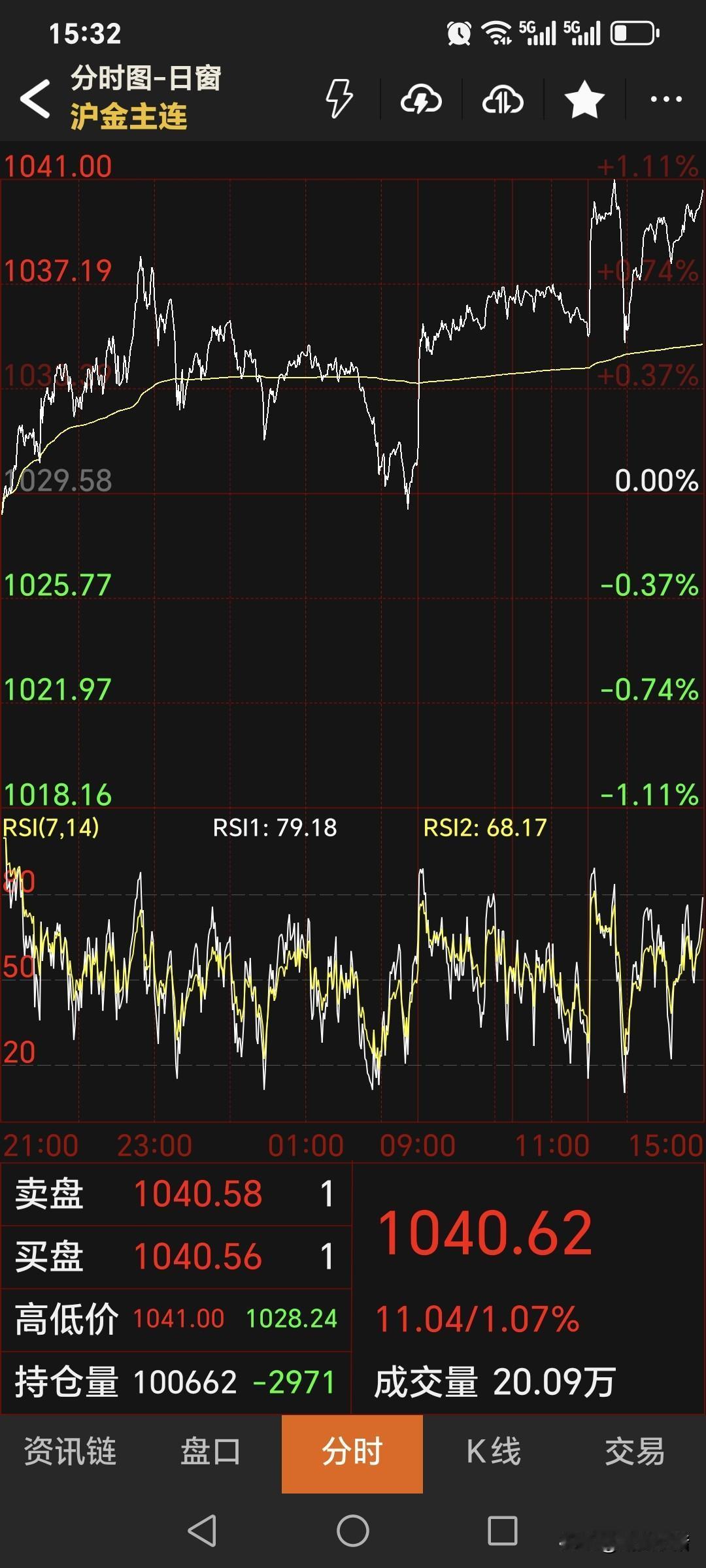 今天是周三, 国内黄金期货 继续走强上涨。 主力合约收盘于1040.62元, 较上一日上涨11.04元, 涨幅为1.07%。 这也是连续第四天上涨。 很多问, 我后悔不后悔没持有住, 期货小褚很乐观, 只赚看到的。继续仰望!