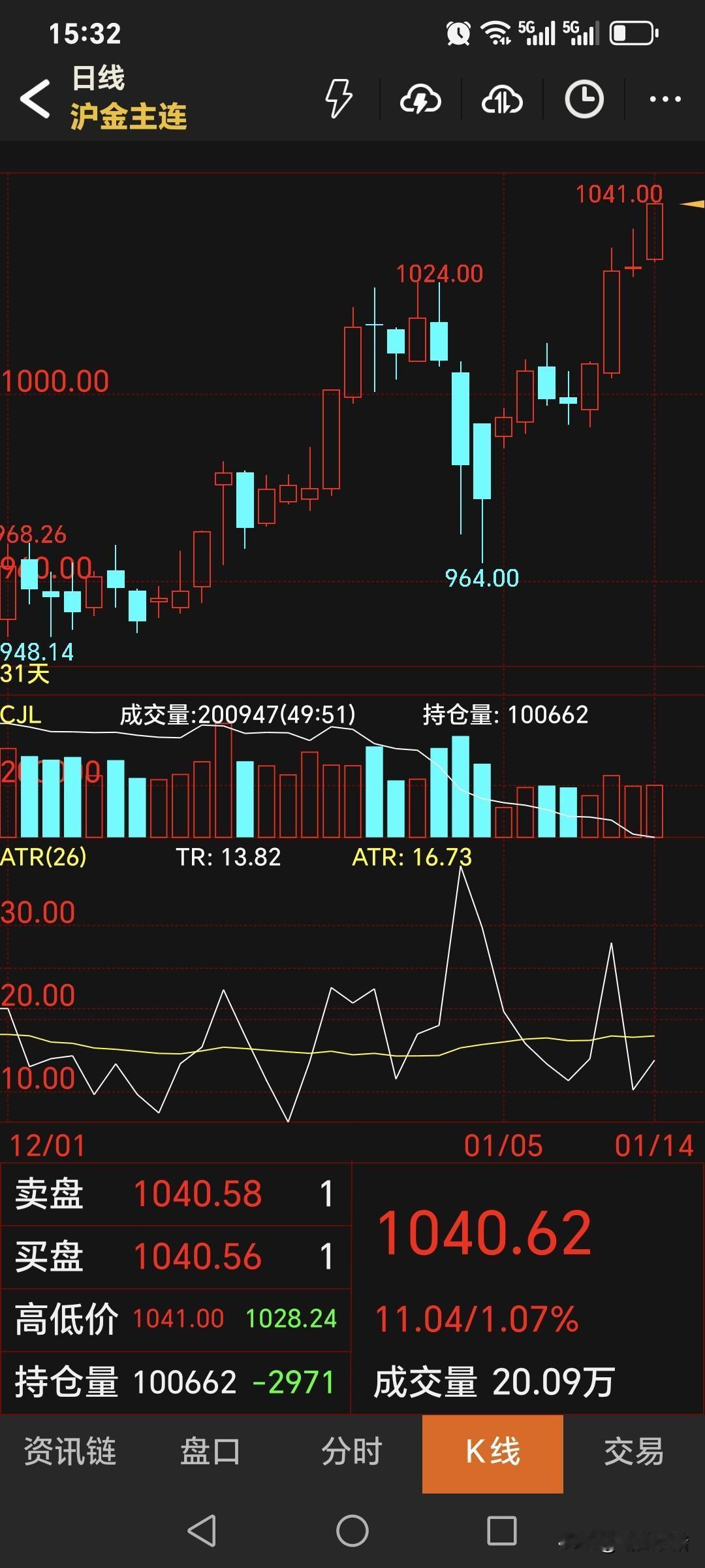 星期三, 国内黄金期货 继续大幅飙升, 再创历史新高。 主力合约收盘于1040.62元, 比昨日收盘高了13.44元; 结算价1035元, 比昨日结算高了5.42元。 当日的开盘价低于收盘价, 因此从盘面看, 依旧收于一根 上涨的红色阳线!
