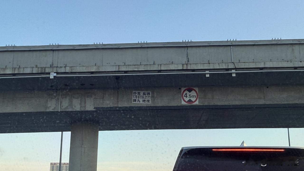 今天路过保定长城大街东二环高架桥路段,发现上边居然贴着一大张广告。 广告的画幅和限高的标识牌大小差不多,上边写着扑克麻将教学,还有电话。 这高度贴上去应该也挺费劲,真不知道他们是咋贴上去的,难道是借助云梯上去贴的吗?