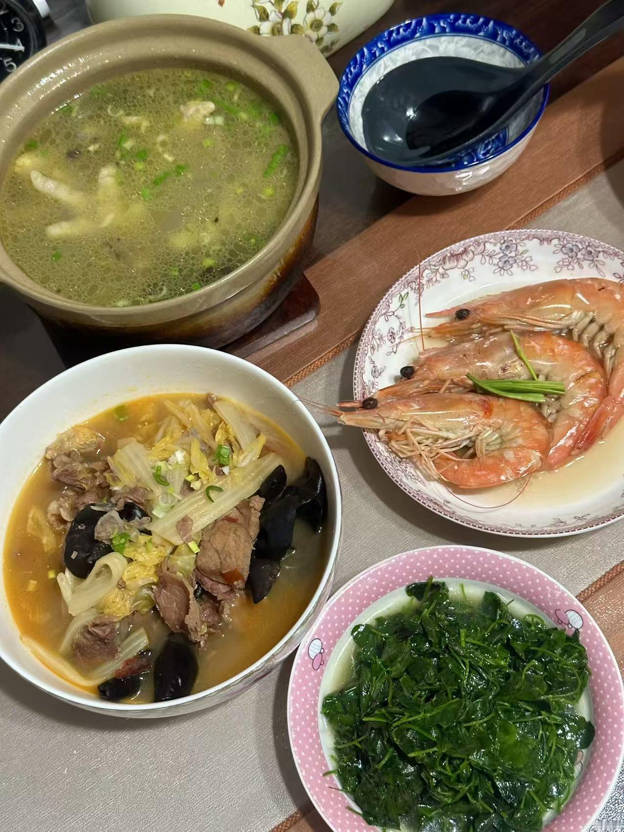 午餐菜品:白菜烧牛肉、清蒸东方对虾、酒香草头、砂锅煲(鸡汤、蘑菇、豆瓣)