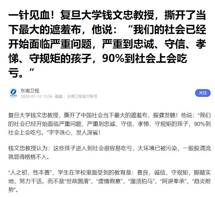 复旦大学钱文忠教授,撕开了中国社会当下最大的遮羞布,振聋发聩!据媒体1月12日报道:他曾经说:“我们的社会已经开始面临严重问题,严重到忠诚、守信、孝悌、守规矩的孩子,90%到社会上会吃亏。”字字诛心,发人深省! 这话听着扎心,但谁都没法否认,咱们一辈子都教孩子老实做人、守规矩、讲诚信,结果到了社会上,这些好品质反倒成了吃亏的病根,这到底是怎么了? 钱文忠教授说得对,这些孩子吃亏真不怪他们,是大环境变了,他们在学校里学的那些纯粹的道理,到社会上撞上了那些摆不上台面的潜规则。 这话太有道理了,咱们身边全是这种事儿。那些听话守规矩的孩子刚踏入社会,就被现实狠狠打了脸,反而那些会投机取巧、滑头滑脑的人,过得顺风顺水,想想就让人憋屈。 就说上班的事儿,杭州有个姑娘叫王敏,在直播公司干活,业绩明明不差,可就是不会跟同事套近乎、跟领导搞关系,天天就知道埋头干活。 结果员工互评的时候分数最低,试用期都没过就被开除了。你说冤不冤?她守着“好好干活就有回报”的规矩,最后却输给了那些“会来事”的人。 不光上班,过日子也一样。武汉有个刚毕业的小伙子乔玉,租房的时候按中介要求交了房租和押金,住了俩月就有人上门闹,说自己是房东,中介没给他交房租,要把乔玉赶出去。 联系中介,对方还让他再交下季度房租才让住,后来才知道这是中介演的双簧,就是骗钱。公安那边统计,200多个受害的租客里,90%都是刚毕业的年轻人。 这些孩子以为签了合同就安全,守着规矩办事,结果被坑得精光,刚出校门就被泼了盆冷水,换谁不心寒? 有人可能觉得这是个别情况,其实不是。有大学曾调查过,在单位里稍微说点瞎话比说实话的,反而更容易混。 人民论坛网也说过,2022年还有近四成人不信陌生人。咱们教孩子待人真诚,可现实里却得处处防着别人,这种反差真能把孩子带偏。 钱文忠说这些,不是让咱们教孩子学坏,是痛心啊!咱们教孩子“说话要算话”,可现实里却是“会哭的孩子有奶吃”。 教孩子“忠厚传家”,可现在忠厚反倒成了“傻”的代名词。长此以往,谁还愿意守规矩?谁还敢教孩子守规矩? 好在现在越来越多人意识到这个问题了,也有地方在改。比如苏州有家百年老店,坚持不用味精,就算亏了也不妥协,最后靠诚信火了。 杭州有些社区给守规矩的老人发诚信积分,能优先买菜;深圳也在试点,对守规矩的企业给税收优惠。这些改变虽然小,但都是希望。 钱文忠把这层遮羞布撕开,不是让咱们绝望,是让咱们警醒。不能再让潜规则横行,不能再让守规矩的孩子吃亏了。 咱们教孩子善良守规矩,不是让他们来吃亏的,是希望他们能生活在一个守规矩就受尊重、讲诚信就有回报的环境里。这不仅是钱教授的期待,也是咱们每一个做父母、做长辈的心愿。
