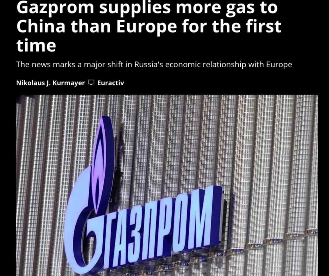 【失之东隅,收之桑榆】 1月14日,Euractiv新闻网消息,俄罗斯天然气工业股份公司对中国的天然气供应量首次实现增长,且供应量超过了输往欧洲的规模。 没有欧洲,俄罗斯依然可以活的很好,但它不能离开中国,尤其是像战争这种特殊环境下。相反,欧洲离开了俄罗斯,它想过得舒坦也不容易,因为它所依仗的美国更是一个唯利是图之徒,不把欧洲榨干是不会收手的。再加之美国在欧洲有庞大的驻军,欧洲更是敢怒不敢言!