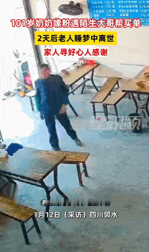 破防了!四川,101岁老人独自出门去米粉店吃米粉。突然,一位男子帮她把钱付了。没想到,老人回去的第二天晚上在睡梦中安详离世。事后,老人的家人想到找到这位好心的男子,当面感谢他。 1月6号下午,老奶奶顺利走到米粉店,找了个舒服的位置坐下,点了一碗心心念念的米粉,热气腾腾的米粉端上来,她慢慢吃着,享受着这份独属于自己的小惬意。 等吃完准备结账,老奶奶正摸索着掏钱的时候,旁边一位中年大哥看在眼里,没多说一句话,悄悄走上前就帮她把钱结了。 大哥做得特别低调,付完钱转身就走,没留名字,也没要任何感谢,等老奶奶反应过来,只看到了他远去的背影,连一句“谢谢”都没来得及说出口。 可这份突如其来的温暖,却实实在在落在了老人心里。 让人唏嘘的是,这份温暖刚停留两天,凌晨的时候,老奶奶就在睡梦里安详走了,没受一点罪,带着那声没说出口的感激,平静地结束了一生。 老人走后,家人忙着料理后事,回忆她最后几天的点滴时,才从米粉店老板嘴里知道了大哥买单的事。 听到真相的那一刻,家人心里又感动又愧疚——感动的是,陌生人能对自家老人这么温柔,愧疚的是,没能早点知道这件事,替老人了了道谢的心愿。 其实谁都清楚,一碗米粉没多少钱,可这份善意在老人生命的最后时刻,比任何贵重的礼物都管用,是实打实暖到心里的慰藉。 为了弥补这个遗憾,也为了替老人说一声迟来的谢谢,家人赶紧联系米粉店调了监控,看清了那位大哥的模样,大概50岁左右。 之后就把监控视频发到了网上,全网找人,就想当面跟大哥道个谢,也让这份善意有个圆满的回应。 有人说“这才是最圆满的告别,老人带着满满的温暖走的”,也有人说“百岁老人还能为一口想吃的东西出门,本身就是对生活的热爱,大哥的举手之劳,恰好成全了这份热爱”。 还有网友夸老人家人的做法,说“懂得回应善意的人,才会让善意一直传下去”。 更有人说“老人走得安详,说不定就是这份善意驱散了最后的孤独”,这些说法都很实在,比起那些轰轰烈烈的大事,这种藏在日常里的温柔,才最能打动普通人。 很多人觉得临终关怀就是细致的照料,可对百岁老人来说,物质早就不重了,一份突如其来的温柔,一份被世界惦记的感觉,比任何照料都管用。 那位大哥没觉得自己做了多大的事,可能就是下意识的举动,可恰恰是这份不刻意的善意,给老人的人生画上了最温暖的句号。 反观现在,很多人遇事先想利弊,怕麻烦、怕被讹,连举手之劳都要犹豫再三,这位大哥的做法,反而显得格外珍贵——善意从来都不是轰轰烈烈的表演,就是这种发自内心的共情和伸手,才最有力量。 你们觉得这位大哥的举动,是不是最动人的温柔? 信息来源:星视频