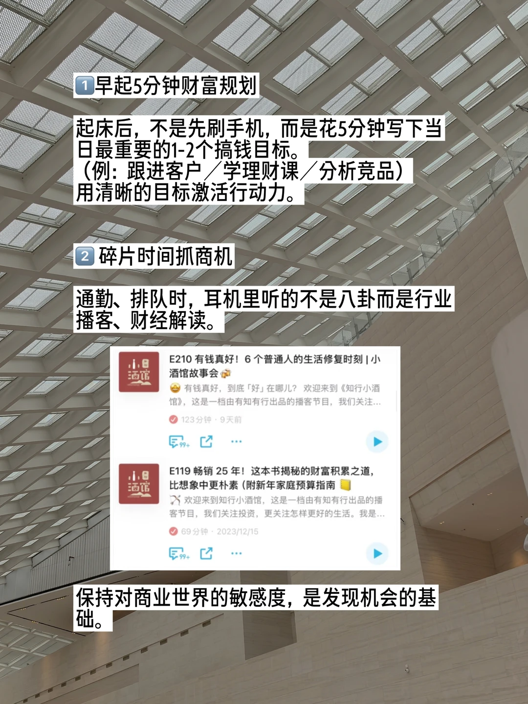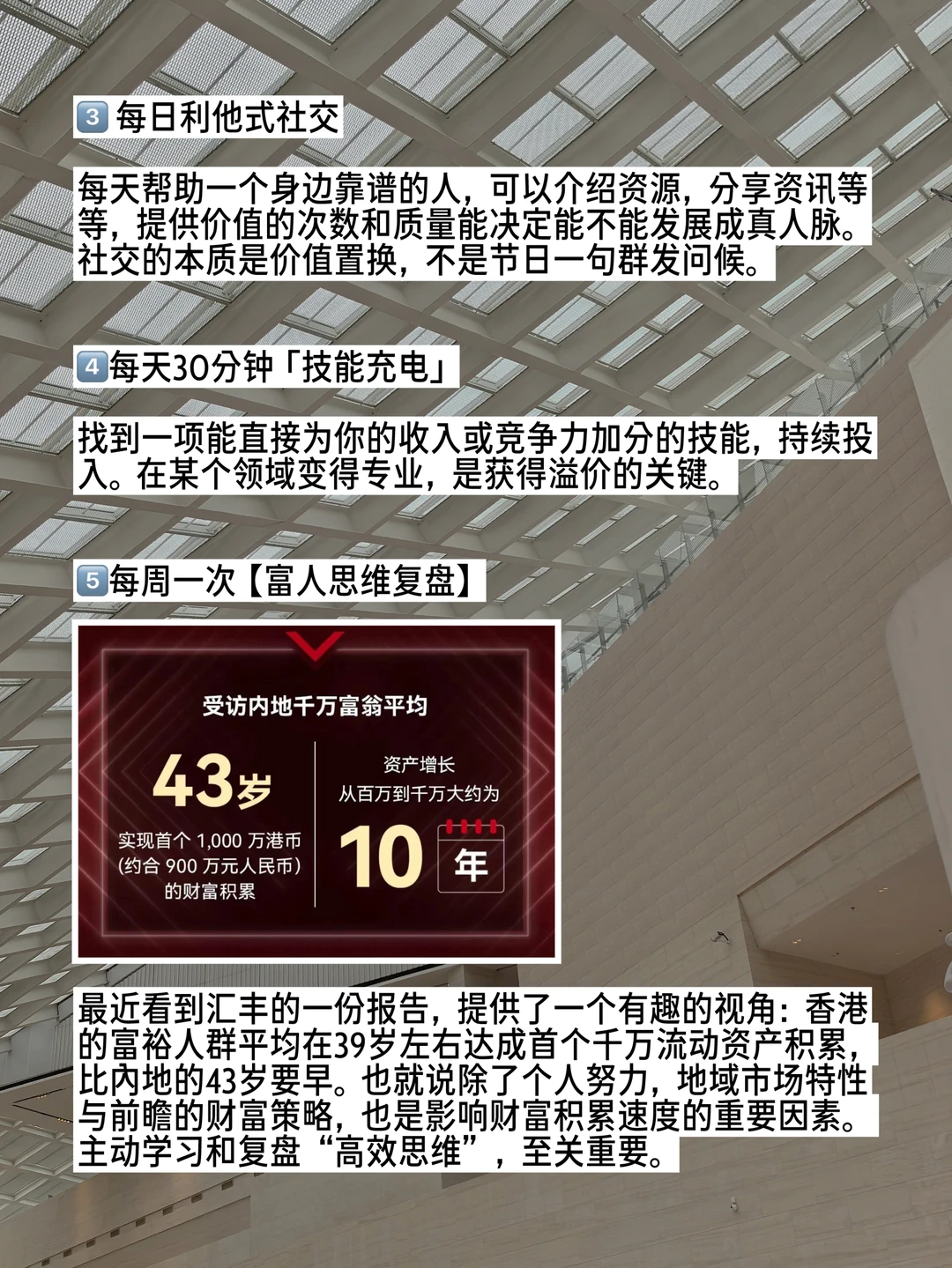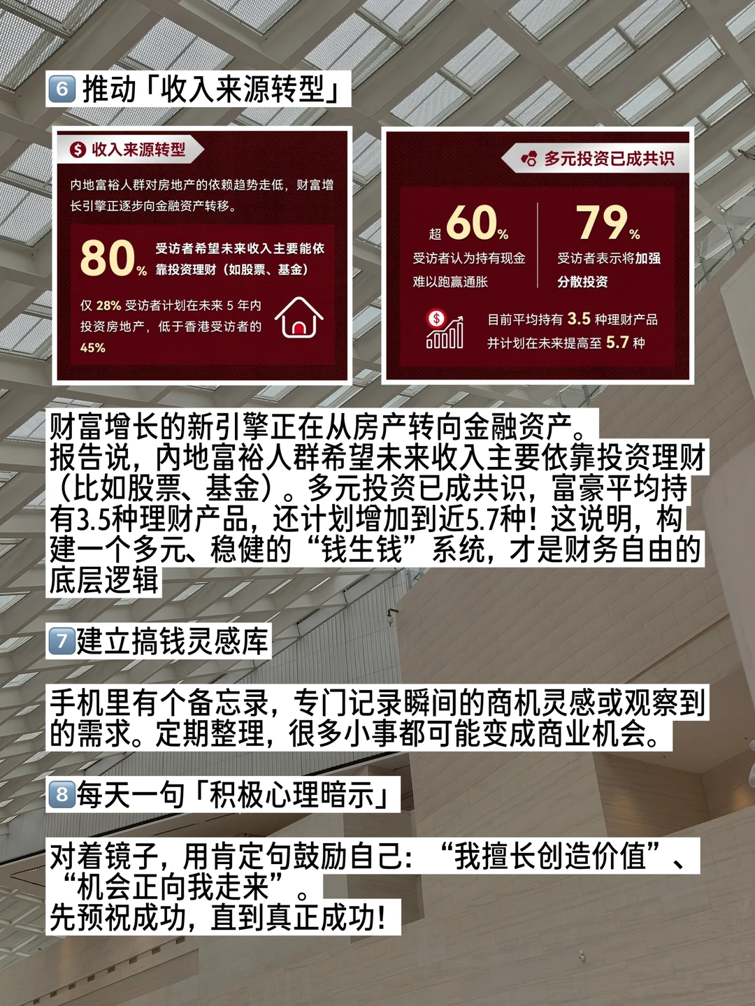 普通女孩如何向小富婆进阶? 我观察了身边那些又美又飒的姐姐们,发现她们都有这几个共同点💪 . 1️⃣早起5分钟财富规划 每天从“掌控感”开始。起床不是先刷手机,而是花5分钟写下当日1-2个搞钱目标。 👌用清晰的目标激活一天的行动力。 . 2️⃣ 碎片时间抓商机 通勤、排队时,耳机里听的不是八卦而是行业播客、财经解读。 👌保持对商业敏感,是发现机会的基础。 . 3️⃣ 利他式社交 每天帮助一个身边靠谱的人,可以介绍资源,分享资讯等等,提供价值的次数和质量能决定能不能发展成真人脉。 👌社交的本质是价值置换,不是节日一句群发问候。 . 4️⃣每天30分钟「技能充电」 确定一项能直接为你的收入或竞争力加分的技能,持续投入。 👌在某个领域变得专,是获得溢价的关键。 . 5️⃣每周一次【富人思维复盘】 最近看到汇丰香港的一份报告,提供了一个有趣的视角:受访的香港千万富翁平均在39岁左右达成首个1千万港币流动资产积累,比内地的43岁要早。这表明除了个人努力,地域市场特性与前瞻的财富策略,也是影响财富积累速度的重要因素。 👌主动学习和复盘这些思维,至关重要。 . 6️⃣ 推动「收入来源转型」 财富增长的新引擎正在从房产转向金融资产。报告说,大部分内地富裕人群希望未来收入主要依靠投资理财比如股票、基金。多元投资已成共识,他们平均持有3.5种理财产品,还计划增加到近5.7种! . 7️⃣建立搞钱灵感库 手机里有个备忘录,专门记录瞬间的商机灵感或观察到的需求。 👌定期整理,很多小事都可能变成商业机会。 . 8️⃣每天一句「积极心理暗示」 对着镜子,用肯定句鼓励自己。积极的心理状态会潜移默化影响你的决策和运气。 👌先预祝成功,直到真的成功 . 9️⃣ 每月一次定期断舍离 清理不再需要的物品、退出八卦广告群,删除低效的App。给大脑内存腾空间装赚钱信息。 👌心灵清爽,能量和财运才会更顺畅地流向你。 . 🔟睡前写「感恩与成就日记」 记录今天哪怕微小的进展和值得感谢的事。专注于“已拥有”和“已进步”,会为你吸引来更多丰盛。汇丰的报告表明,大部分受访香港千万富翁并非天生富贵,近70%是靠自己积累的财富。 👌感恩当下的每一步努力与小成就,是复刻“白手起家”的成功者走过的蕞扎实的路径。 .