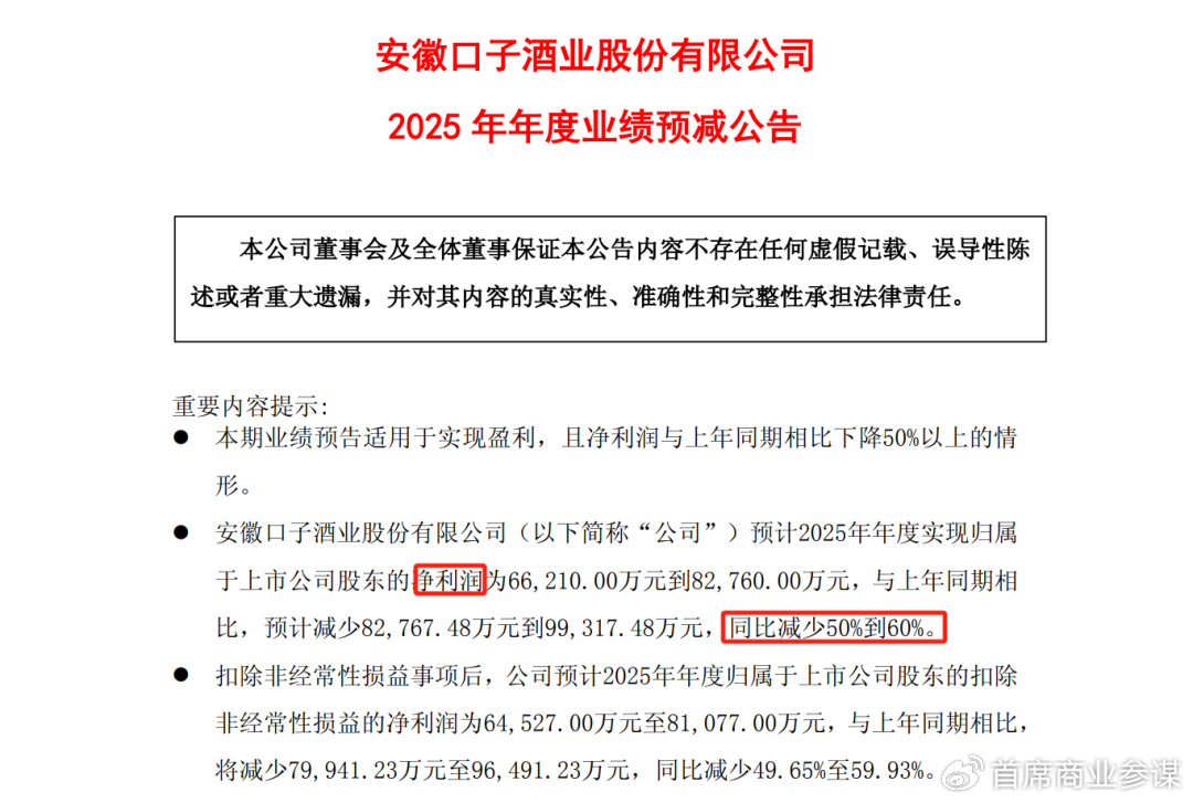 真正的产业信号,往往隐藏在冰冷的财务数字里。日前“徽酒老三”口子窖交出2025年业绩预告,其归母净利润预计同比锐减50%—60%,仅为6.62亿至8.28亿元。