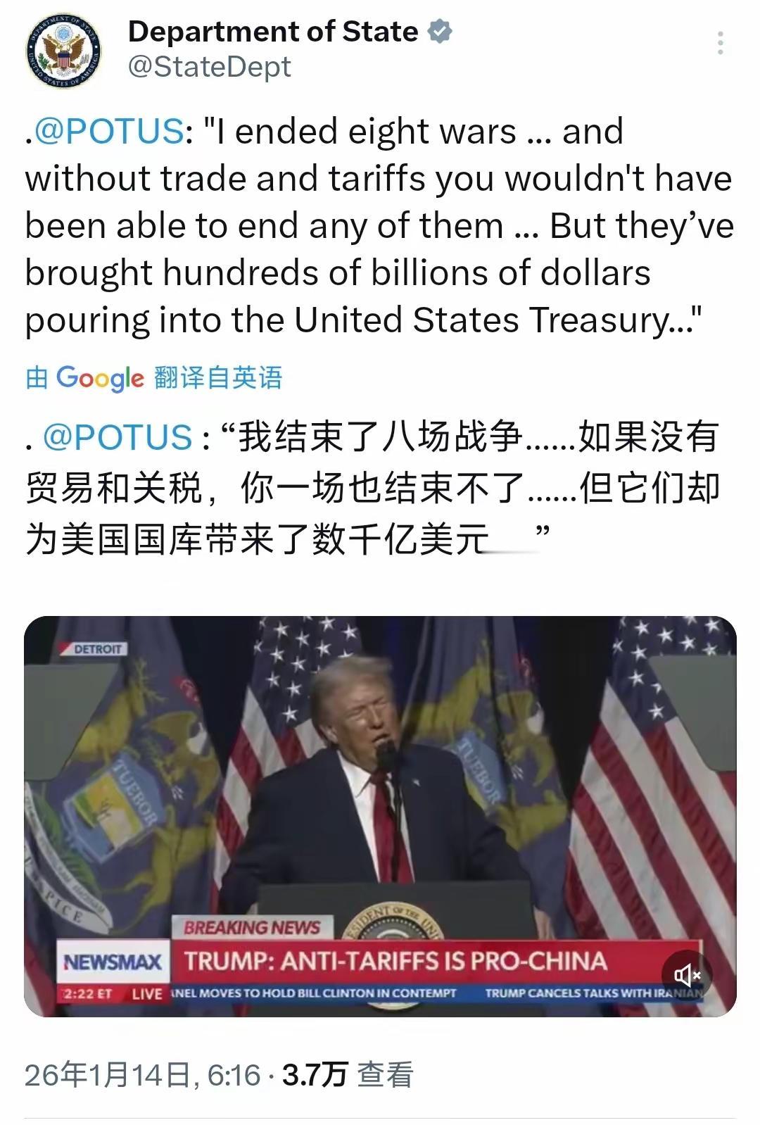 发生了什么事能让美国国务院今天(1月14日)15分钟内连发两推转发特朗普的讲话?