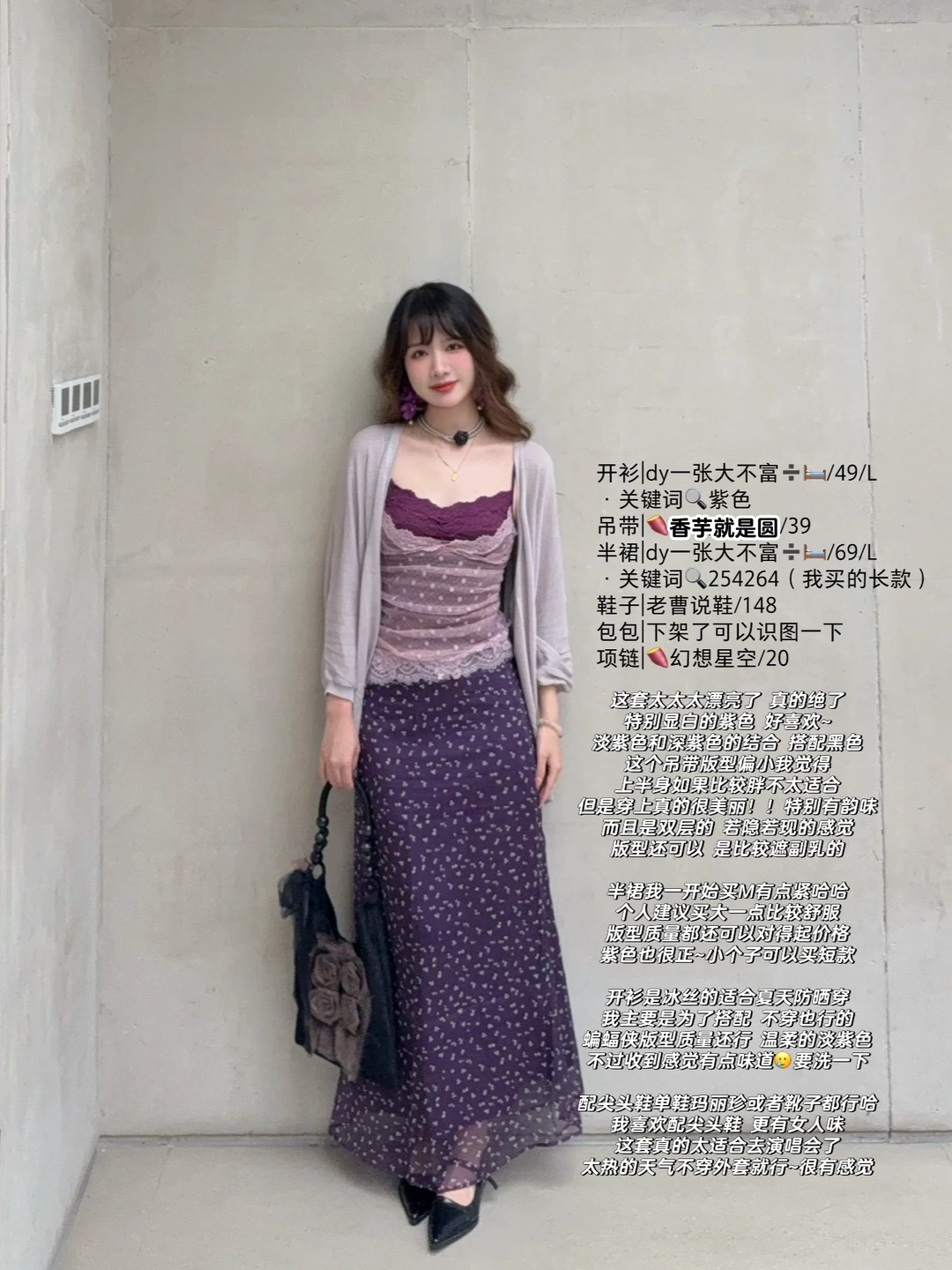 168/106 纯分享理性种草 嗯 紫色应援穿搭已经发了很多了 票一张都抢不到🥲🥲🥲🥲心如死灰 不过我抢到了汪苏泷哇咔咔咔 粉色系应援色穿搭已经在路上了嘿嘿 这套真的超级貌美 当时买这个吊带就觉得很搭这个裙子 没想到真的很不错!特别显白~ 配尖头鞋有点气质女人的感觉 一般来说配玛丽珍单鞋方头鞋高跟鞋 甚至是凉鞋都是可以的 (德训也行) 可以不穿外套哈 单穿吊带➕半裙也很美~ 毕竟天气比较热 开衫只是提供一种搭配思路~